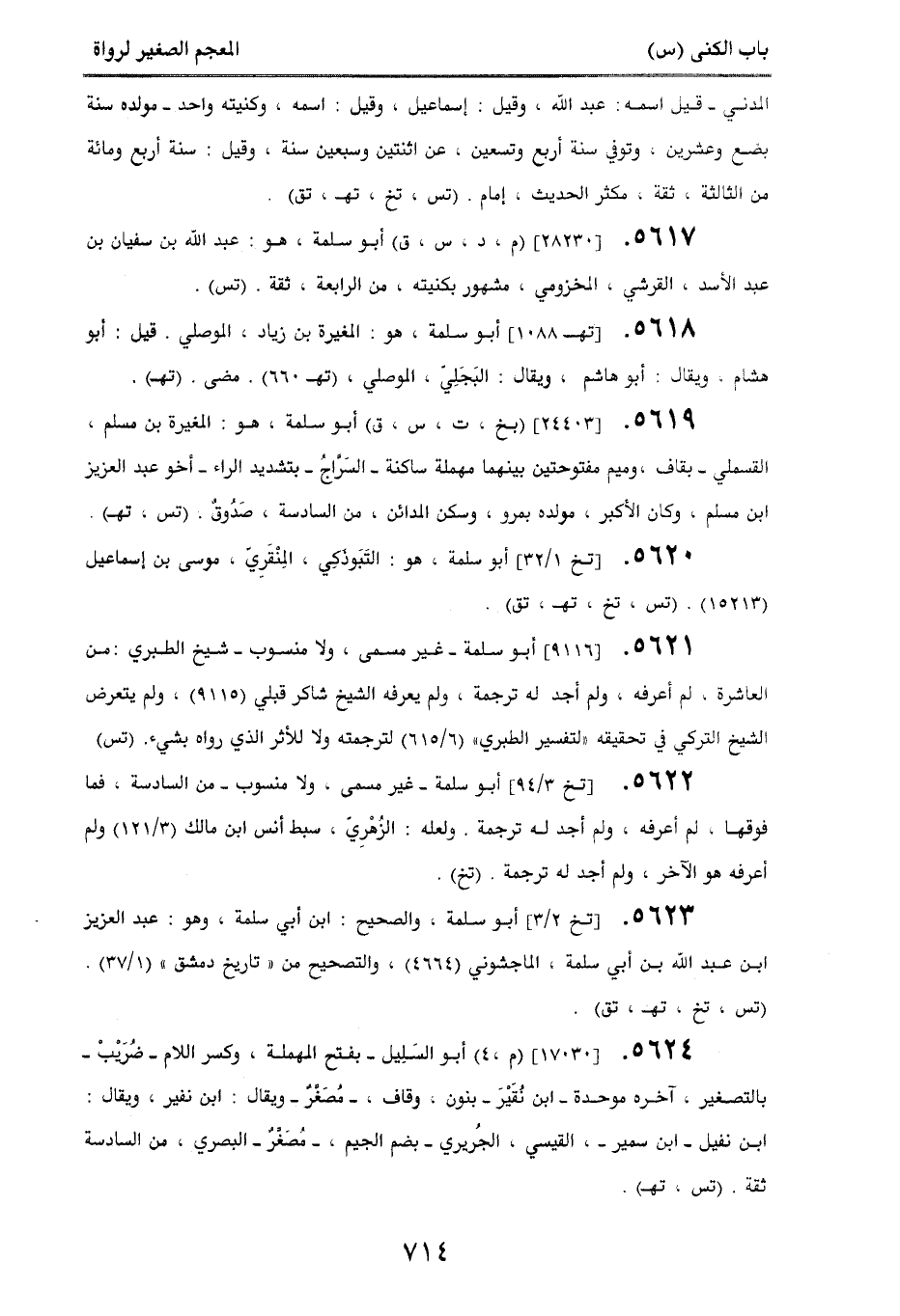 5622. [تخ 3/ 94] أبو سلمة - غير مسمى، ولا منسوب - من السادسة، فما فوقها، لم أعرفه، ولم أجد له ترجمة، ولعله الزهرِي، سبط أنس بن مالك (3/ 121) ولم أعرفه هو الآخر، ولم أجد له ترجمة. (تخ).