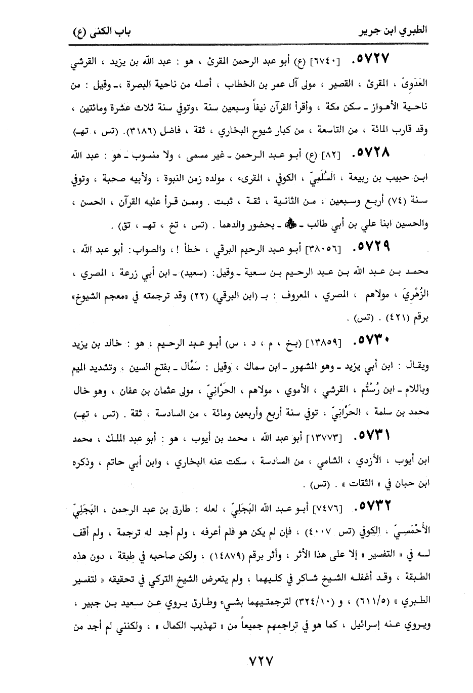 5728. [82] (ع) أبو عبد الرحمن - غير مسمى، ولا منسوب - هو: عبد الله بن حبيب بن ربيعة، السلَمِي، الكوفي، المقرئ، مولده زمن النبوة، ولأبيه صحبة، وتوفي سنة (74) أربع وسبعين، من الثانية، ثقة، ثبت. وممن قرأ عليه القرآن، الحسن والحسين ابنا علي بن أبي طالب - رضي الله عنهم - بحضور والدهما. (تس، تخ، تهـ، تق).