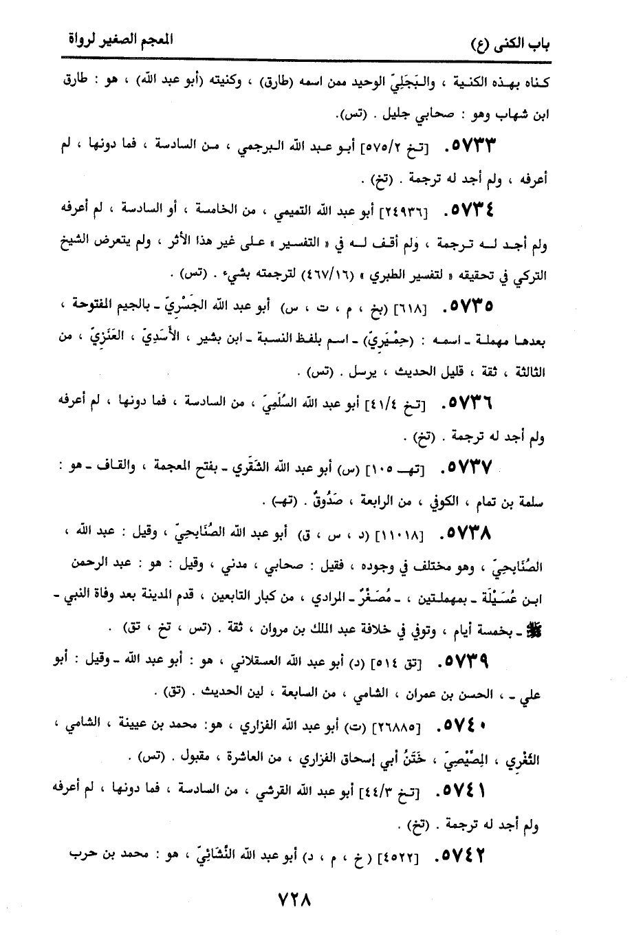 5738. [11018] (د، س، ق) أبو عبد الله الصنَابحِي، وقيل: عبد الله، الصنَابحِي، وهو مختلف في وجوده، فقيل: صحابي، مدني، وقيل: هو: عبد الرحمن بن عسَيلَة - بمهملتين - مصَغر - المرادي، من كبار التابعين، قدم المدينة بعد وفاة النبي - صلى الله عليه وسلم - بخمسة أيام، وتوفي في خلافة عبد الملك بن مروان، ثقة. (تس، تخ، تق).