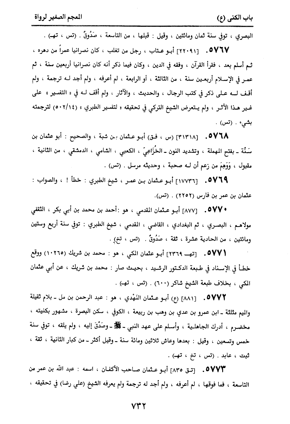 5773. [تق 835] أبو عثمان صاحب الأكفان، اسمه: عبد الله بن عمر من التاسعة، فما فوقها، لم أعرفه، ولم أجد له ترجمة، ولم يعرفه الشيخ (علي رضا) في تحقيقه،