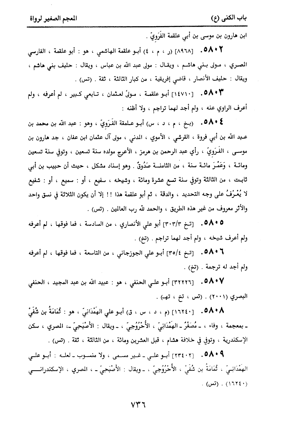 5802. [8968] (ر، م، 4) أبو علقمة الهاشمي، هو: أبو علقمة، الفارسي المصري، مولى بني هاشم، ويقال: مولى عبد الله بن عباس، ويقال: حليف بني هاشم، ويقال: حليف الأنصار، قاضي إفريقية، من كبار الثالثة، ثقة. (تس).