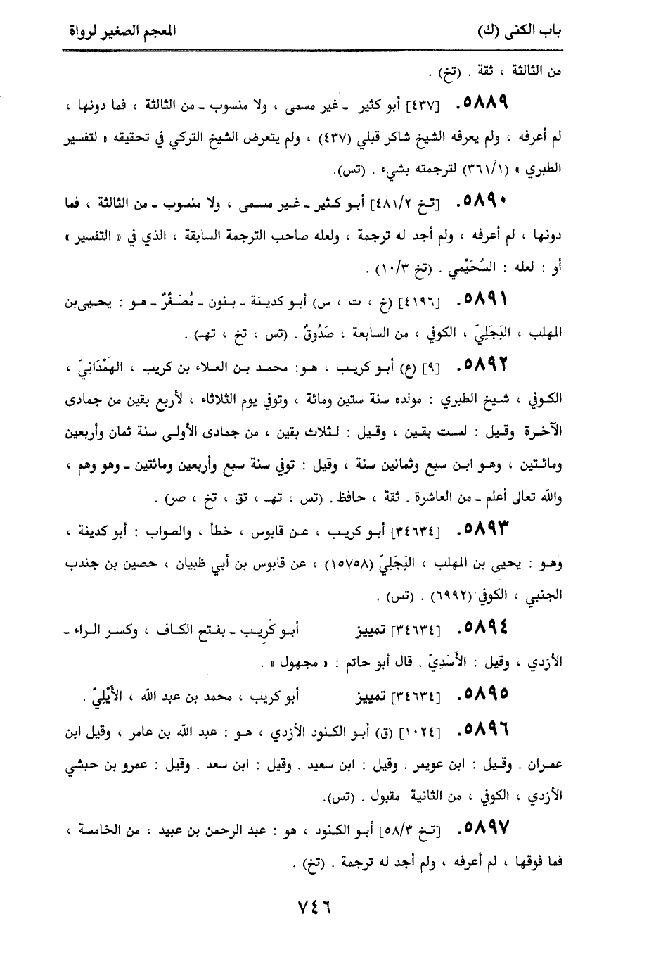 5890. [تخ 2/ 481] أبو كثير - غير مسمى، ولا منسوب - من الثالثة، فما دونها، لم أعرفه، ولم أجد له ترجمة، ولعله صاحب الترجمة السابقة، الذي في ((التفسير)) أو: لعله السحيمي. (تخ 3/ 10).