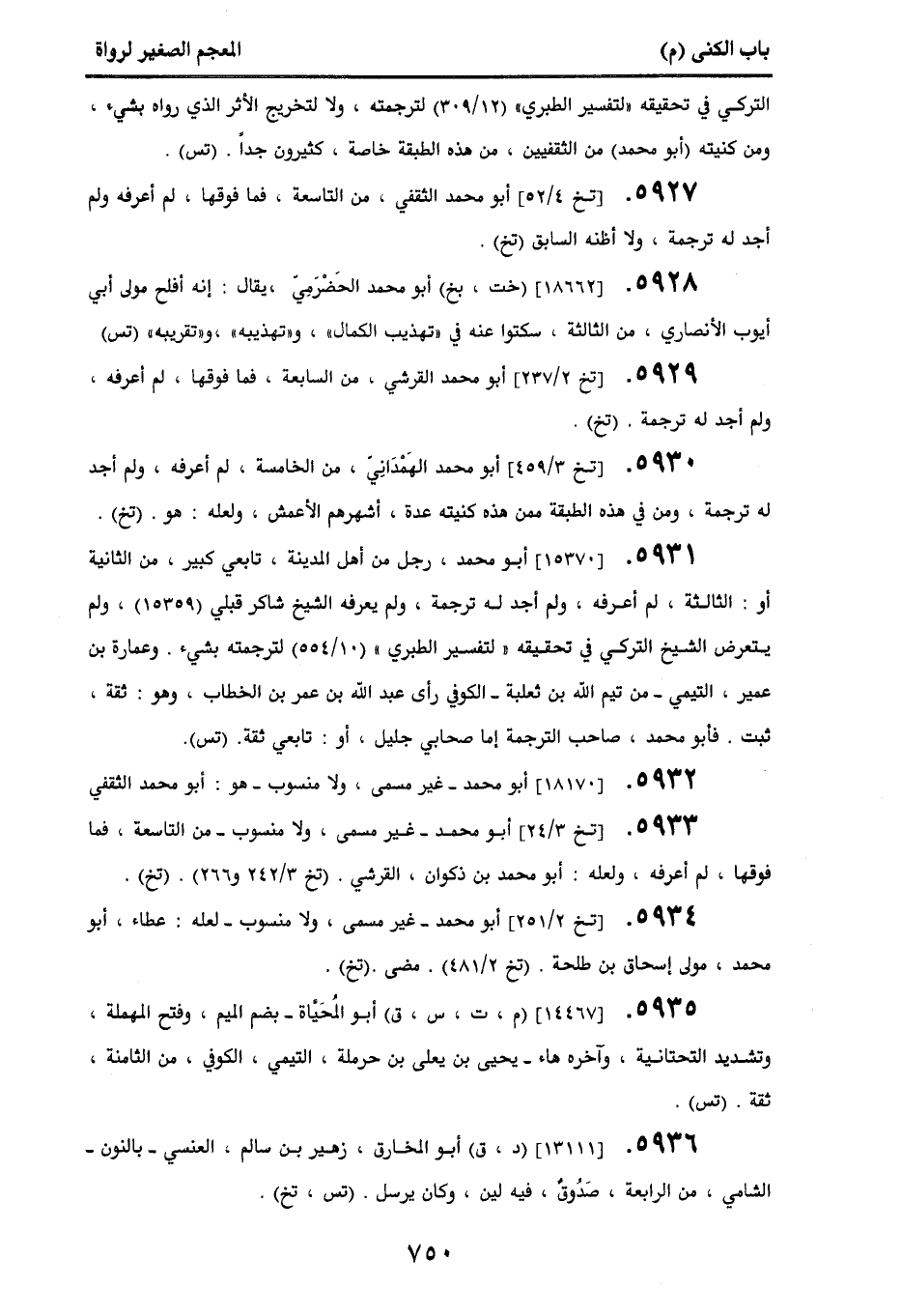 5930. [تخ 3/ 459] أبو محمد الهمدانِي، من الخامسة، لم أعرفه، ولم أجد له ترجمة، ومن في هذه الطبقة ممن هذه كنيته عدة، أشهرهم الأعمش، ولعله هو. (تخ).
