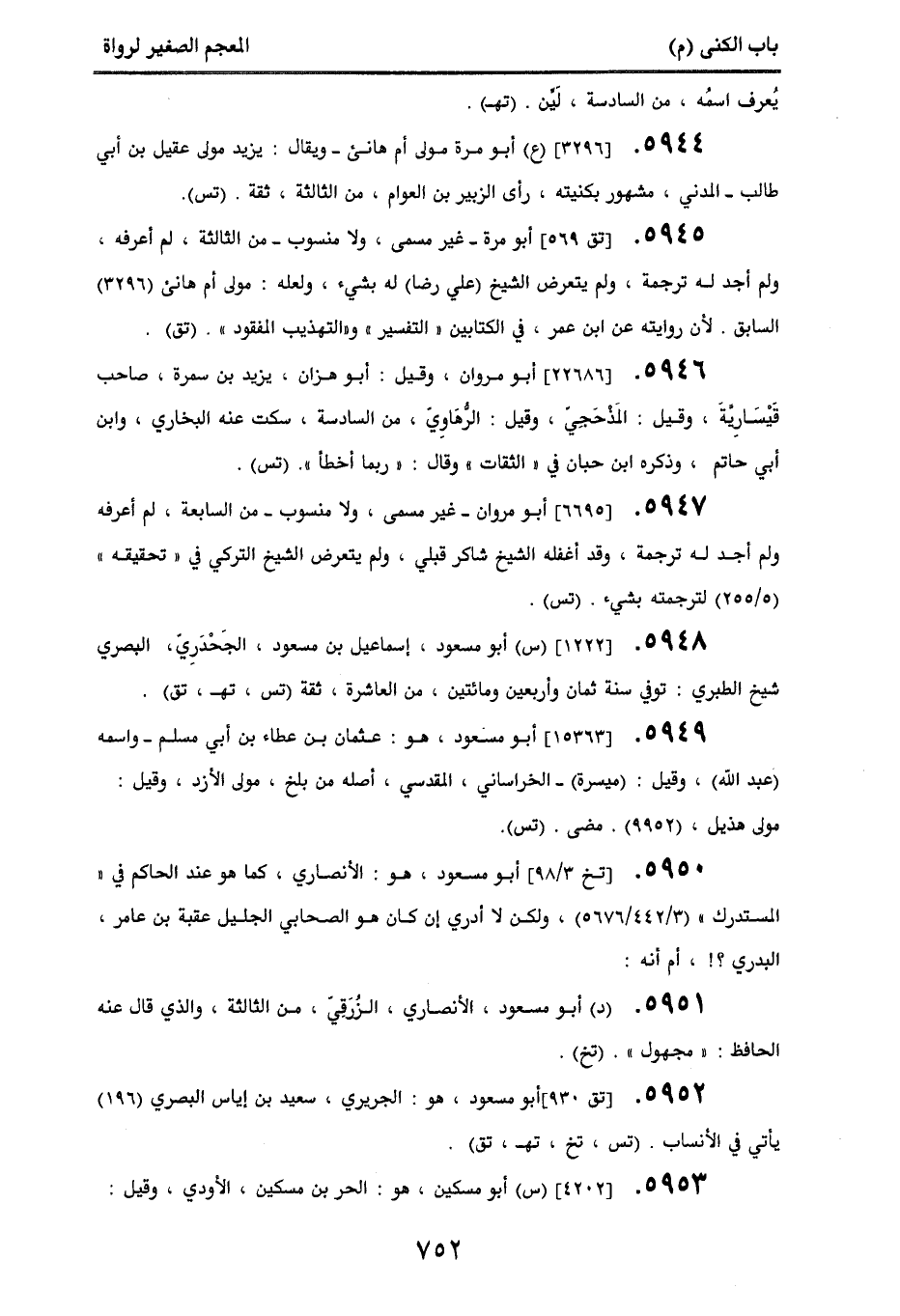 5952. [تق 930] أبو مسعود، هو: الجريري، سعيد بن إياس البصري (196) يأتي في الأنساب. (تس، تخ، تهـ، تق).