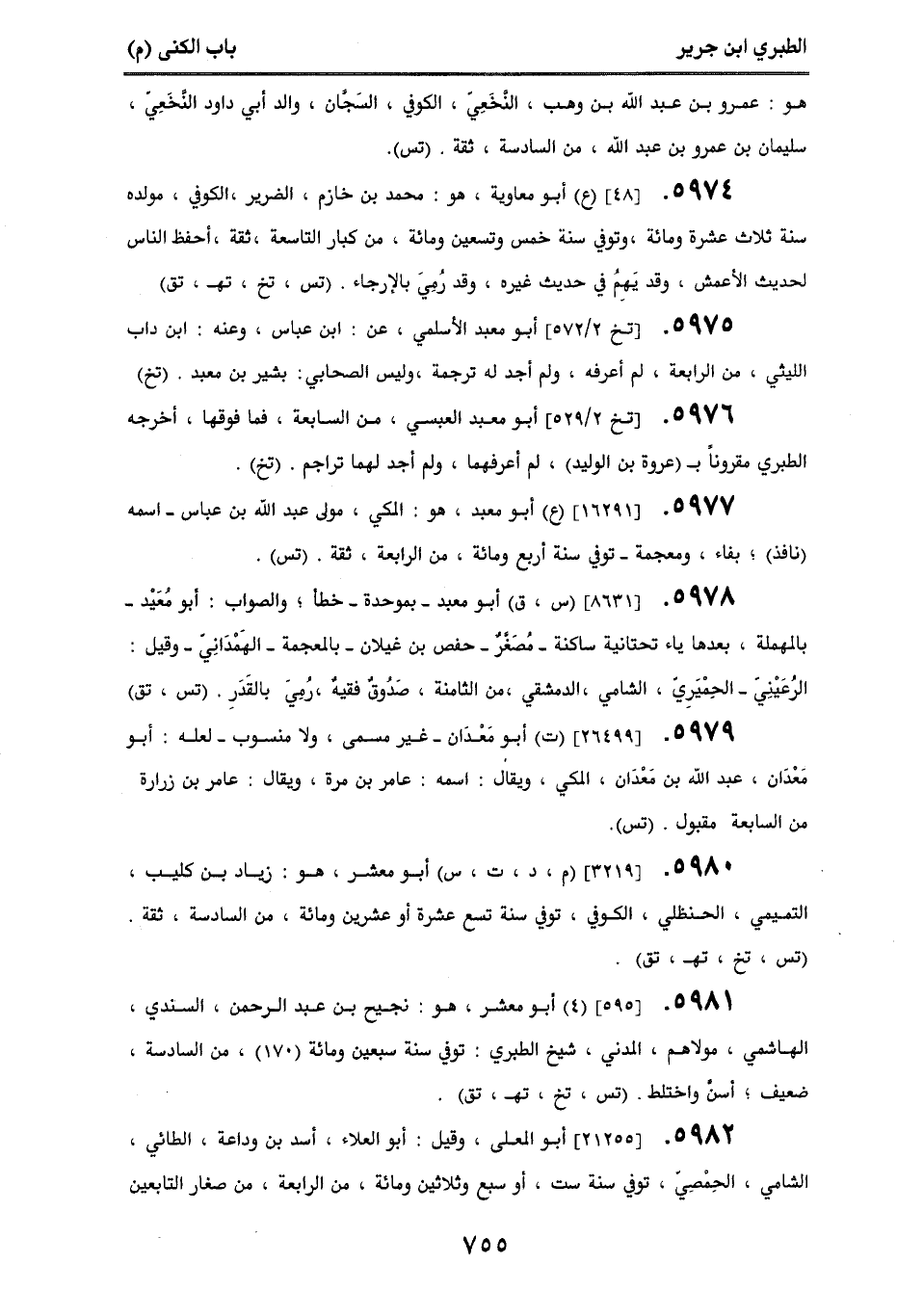 5981. [595] (4) أبو معشر، هو: نجيح بن عبد الرحمن، السندي، الهاشمي، مولاهم، المدني، شيخ الطبري: توفي سنة سبعين ومائة (170)، من السادسة، ضعيف، أسن واختلط. (تس، تخ، تهـ، تق).