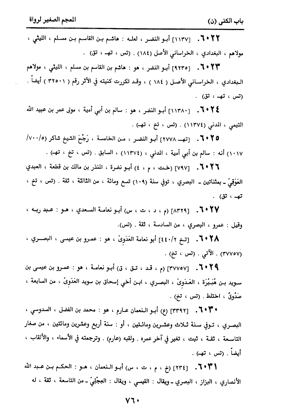 6026. [797] (خت، م، 4) أبو نضرة، المنذر بن مالك بن قطعة، العبدي العوقِي - بمثناتين - البصري، توفي سنة (109) تسع ومائة، من الثالثة، ثقة. (تس، تخ، تهـ، تق).