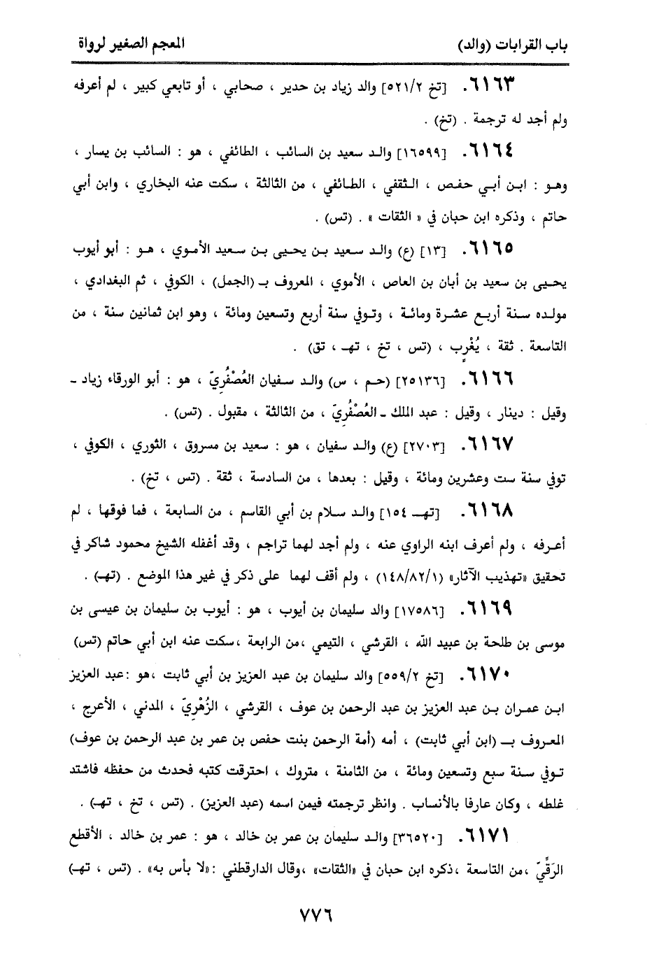 6167. [2703] (ع) والد سفيان، هو: سعيد بن مسروق، الثوري، الكوفي، توفي سنة ست وعشرين ومائة، وقيل: بعدها، من السادسة، ثقة. (تس، تخ).