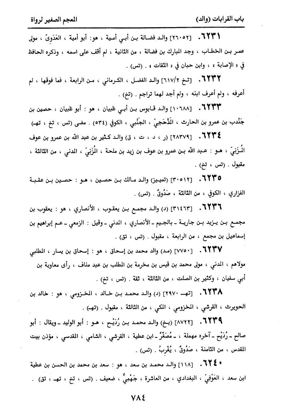 6240. [118] والد محمد بن سعد، هو: سعد بن محمد بن الحسن بن عطية بن سعد، العوفي، البغدادي، من العاشرة، جهمي، ضعيف. (تس، تخ، تهـ، تق).