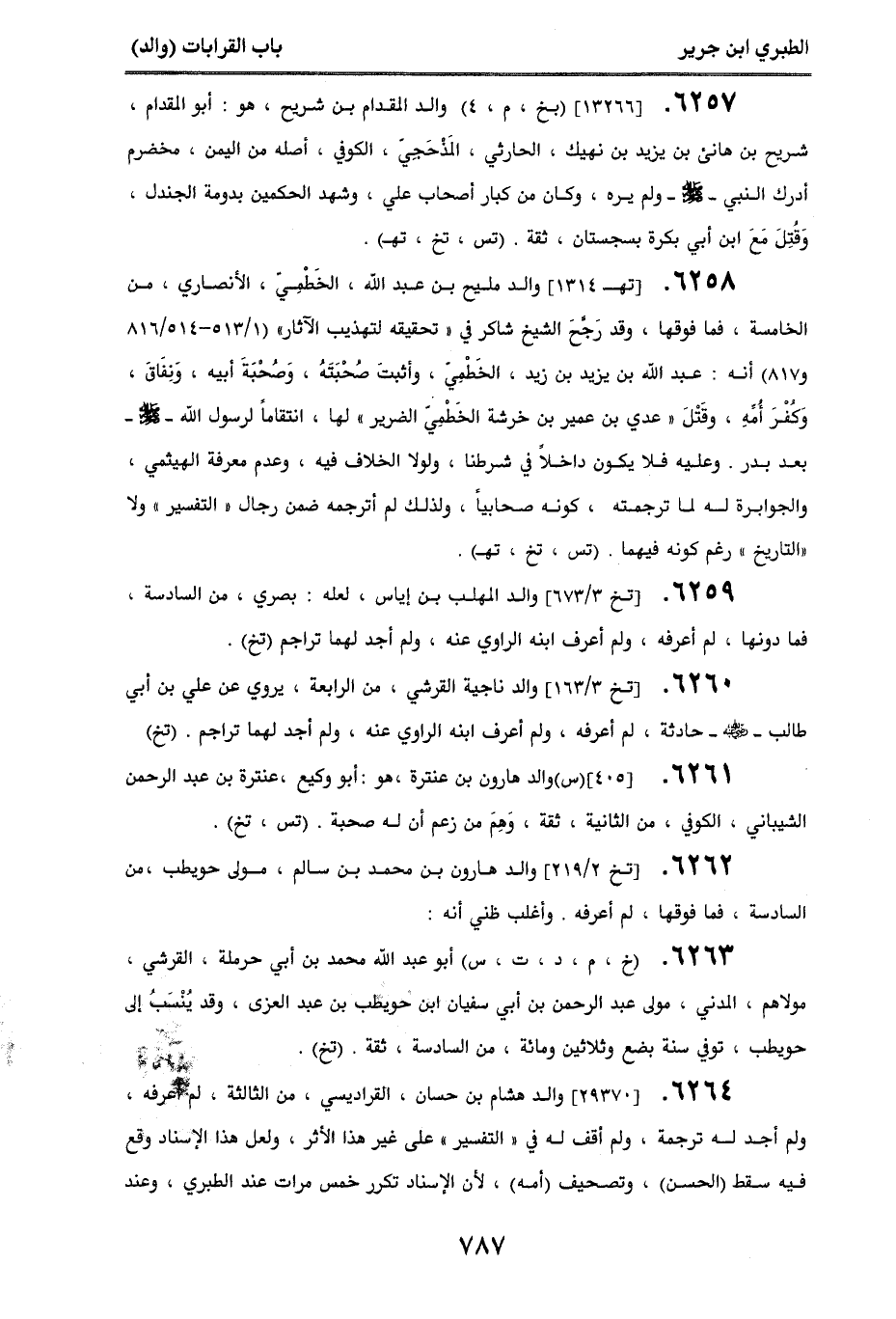 6257. [13266] (بخ، م، 4) والد المقدام بن شريح، هو: أبو المقدام، شريح بن هانئ بن يزيد بن نهيك، الحارثي، المذحجي، الكوفي، أصله من اليمن، مخضرم، أدرك النبي - صلى الله عليه وسلم - ولم يره، وكان من كبار أصحاب علي، وشهد الحكمين بدومة الجندل، وقتل مع ابن أبي بكرة بسجستان، ثقة. (تس، تخ، تهـ).