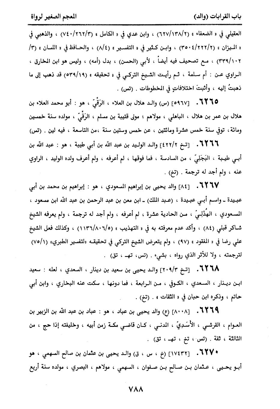 6265. [5967] (س) والد هلال بن العلاء، الرقي، هو: أبو محمد العلاء بن هلال بن عمر بن هلال، الباهلي؛ مولاهم، مولى قتيبة بن مسلم، الرقي، مولده سنة خمسين ومائة، توفي سنة خمس عشرة ومائتين، عن خمس وستين سنة، من التاسعة، فيه لين. (تس).