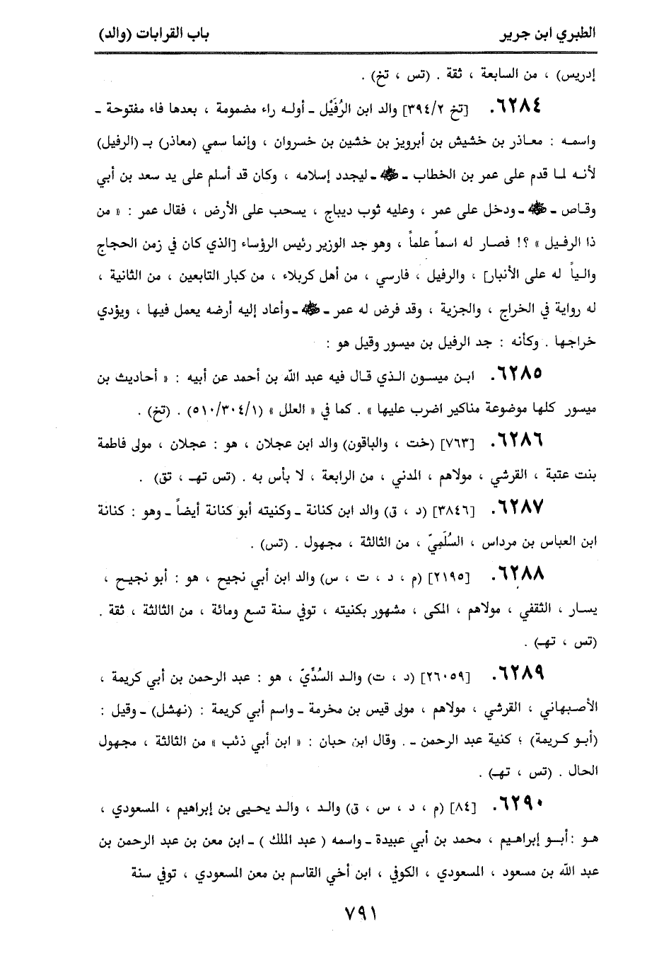6284. [تخ 2/ 394] والد ابن الرفيل - أوله راء مضمومة، بعدها فاء مفتوحة - واسمه: معاذر بن خشيش بن أبرويز بن خشين بن خسروان، وإنما سمي (معاذر) بـ (الرفيل) لأنه لما قدم على عمر بن الخطاب - رضي الله عنه - ليجدد إسلامه، وكان قد أسلم على يد سعد بن أبي وقاص - رضي الله عنه - وعليه ثوب ديباج، يسحب على الأرض، فقال عمر: ((من ذا الرفيل))؟! فصار له اسمًا علمًا، وهو جد الوزير رئيس الرؤساء [الذي كان في زمن الحجاج واليًا له على الأنبار]، والرفيل، فارسي، من أهل كربلاء، من كبار التابعين، من الثانية، له رواية في الخراج، والجزية، وقد فرض له عمر - رضي الله عنه - وأعاد إليه أرضه يعمل فيها، ويؤدي خراجها، وكأنه: جد الرفيل بن ميسور وقيل: هو: