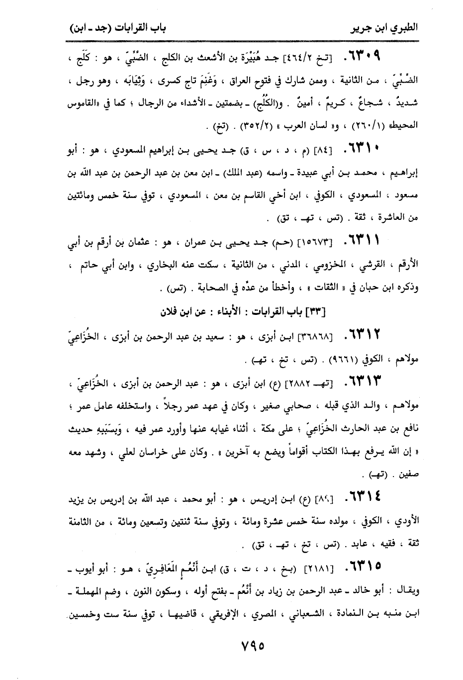 6312. [36868] ابن أبزى، هو: سعيد بن عبد الرحمن بن أبزى، الخزاعي، مولاهم، الكوفي (9661). (تس، تخ، تهـ).