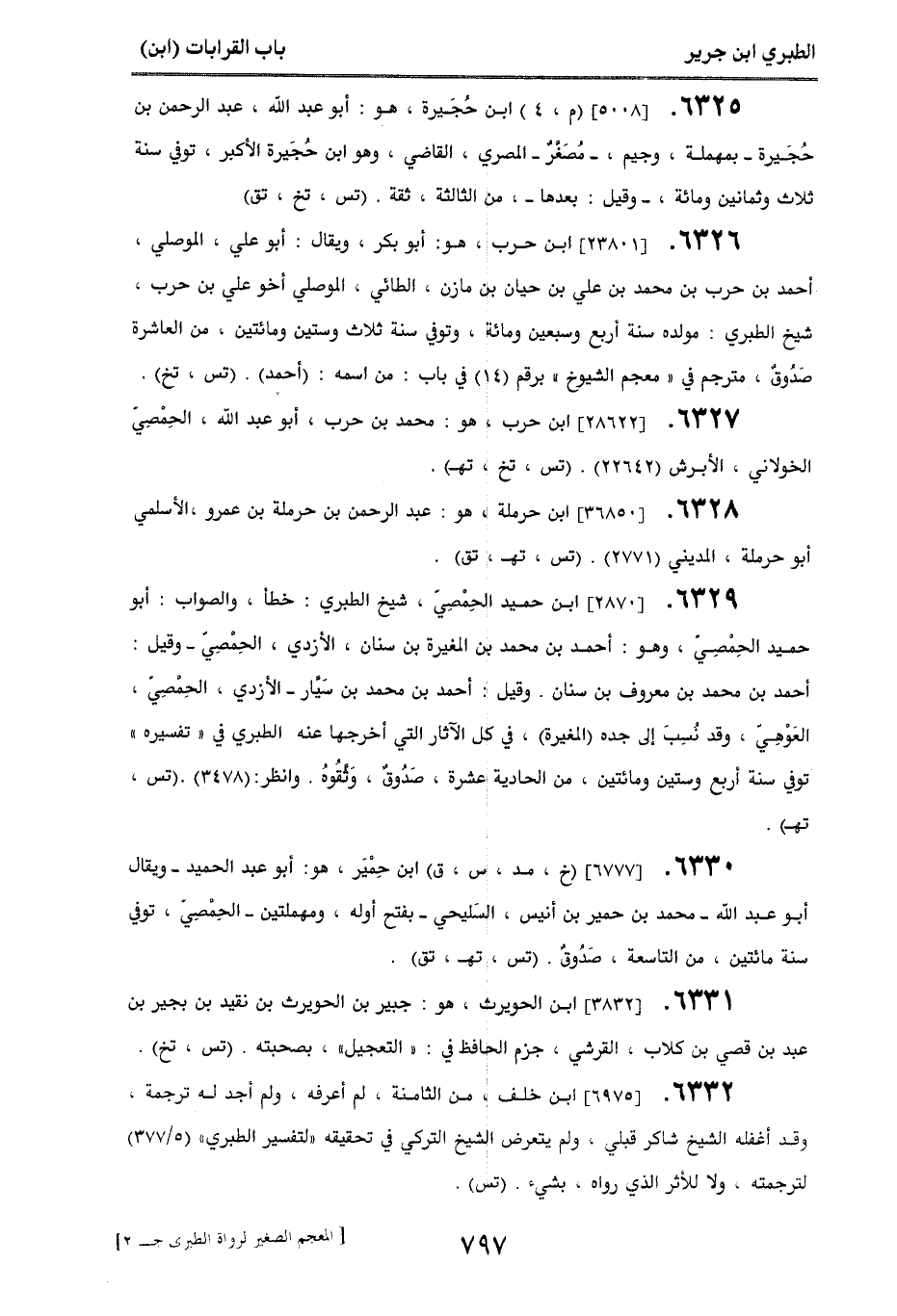 6329. [2870] ابن حميد الحمصي، شيخ الطبري: خطأ، والصواب: أبو حميد الحمصي، وهو: أحمد بن محمد بن المغيرة بن سنان، الأزدي، الحمصي - وقيل: أحمد بن محمد بن معروف بن سنان. وقيل: أحمد بن محمد بن سيار - الأزدي، الحمصي، العوهي، وقد نسب إلى جده (المغيرة)، في كل الآثار التي أخرجها عنه الطبري في ((تفسيره)) توفي سنة أربع وستين ومائتين، من الحادية عشرة، صدوق، وثقوه. وانظر (3478). (تس، تهـ).