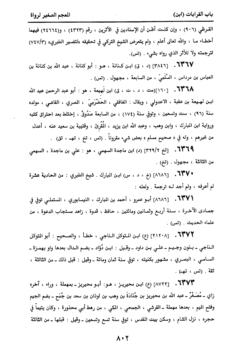 6367. [3846] (د، ق) ابن كنانة، هو: أبو كنانة، عبد الله بن كنانة بن العباس بن مرداس، السلمي، من السابعة، مجهول. (تس).