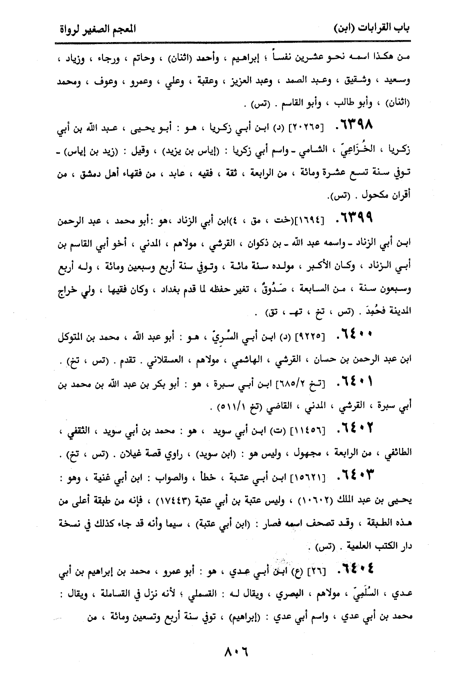 6399. [1694] (خت، مق، 4) ابن أبي الزناد، هو: أبو محمد، عبد الرحمن بن أبي الزناد - واسمه: عبد الله - بن ذكوان، القرشي، مولاهم، المدني، أخو أبي القاسم بن أبي الزناد، وكان الأكبر، مولده سنة مائة، وتوفي سنة أربع وسبعين ومائة، وله أربع وسبعون سنة، من السابعة، صدوق، تغير حفظه لما قدم بغداد، وكان فقيهًا، ولي خراج المدينة فحمد. (تس، تخ، تهـ، تق).