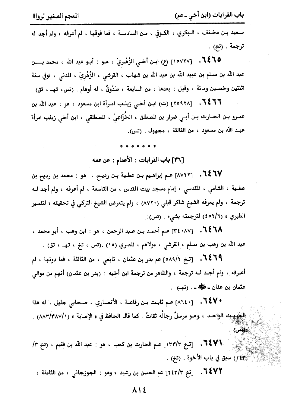 6466. [25928] (ت) ابن أخي زينب، امرأة ابن مسعود، هو عبد الله بن عمرو بن الحارث بن أبي ضرار بن المصطلق الخزاعي المصطلقي، ابن أخي زينب امرأة عبد الله بن مسعود، من الثالثة، مجهول. (تس).