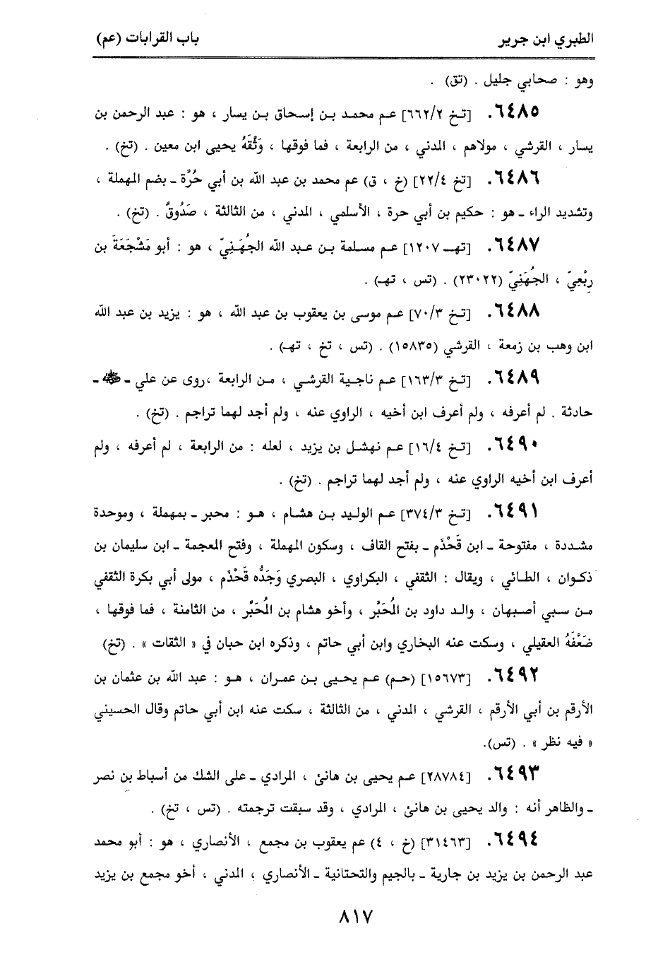 6485. [تخ 2/ 662] عم محمد بن إسحاق بن يسار، هو عبد الرحمن بن يسار القرشي، مولاهم المدني، من الرابعة، فما فوقها، وثقه يحيى بن معين. (تخ).
