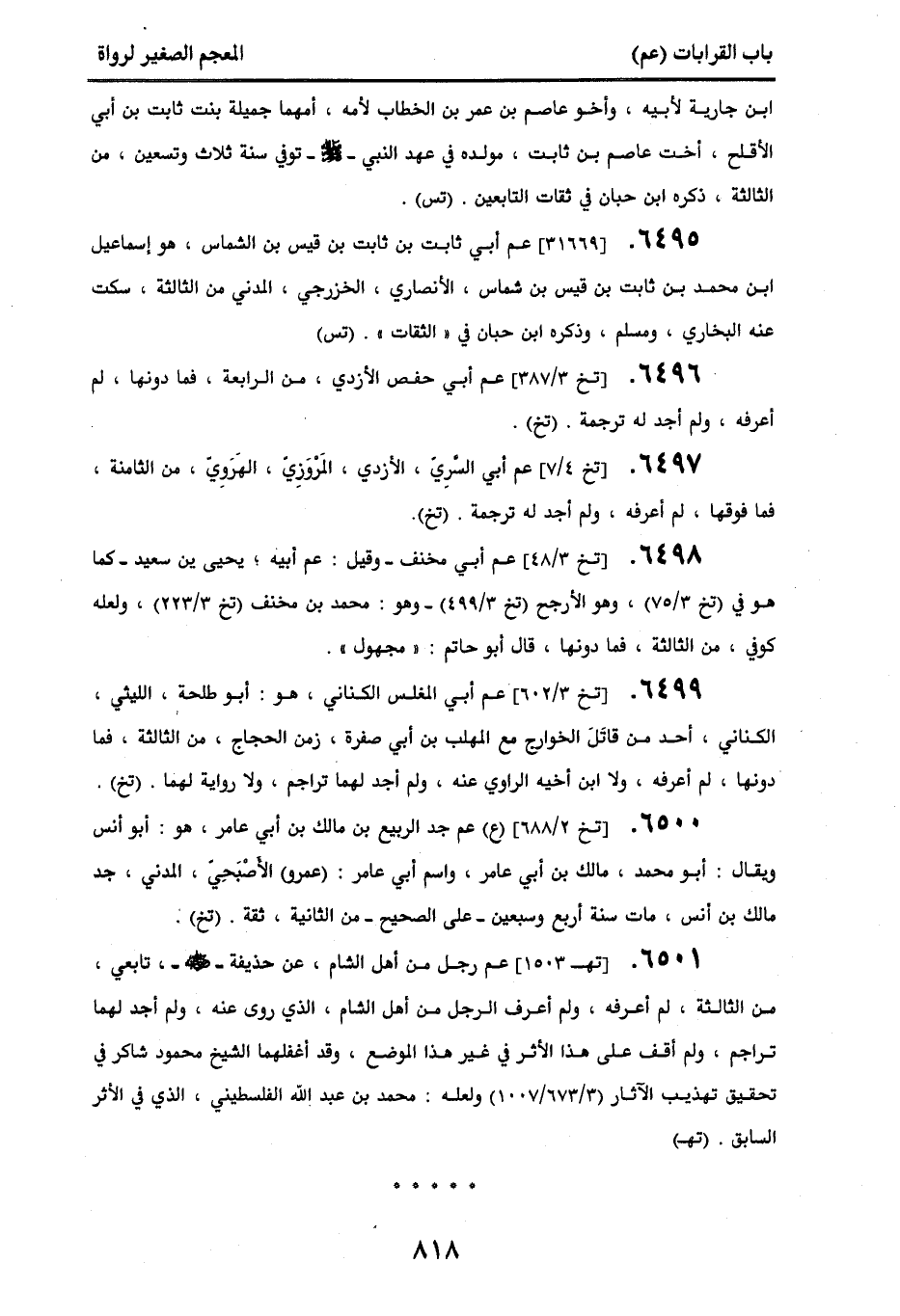 6498. [تخ 3/ 48] عم أبي مخنف - وقيل: عم أبيه؛ يحيى بن سعيد - كما هو في (تخ 3/ 75)، وهو الأرجح (تخ 3/ 499) - وهو: محمد بن مخنف (تخ 3/ 223)، ولعله كوفي، من الثالثة، فما دونها، قال أبو حاتم: ((مجهول)).
