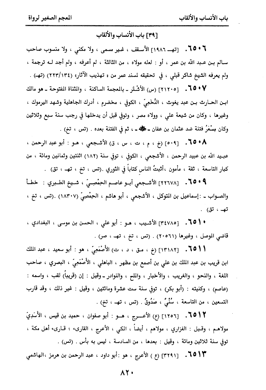 6511. [13182] (خ، مق، د، ت) الأصمعي، هو أبو سعيد عبد الملك بن قريب بن عبد الملك بن علي بن أصمع بن مظهر الباهلي الأصمعي البصري، صاحب اللغة، والنحو، والغريب، والأخبار، والملح، والنوادر - وقيل: إن (قريبًا) لقب، واسمه: (عاصم)، وكنيته: (أبو بكر)، توفي سنة ست عشرة ومائتين، وقيل: غير ذلك، وقد قارب التسعين، من التاسعة، سني، صدوق. (تس، تهـ، تخ).