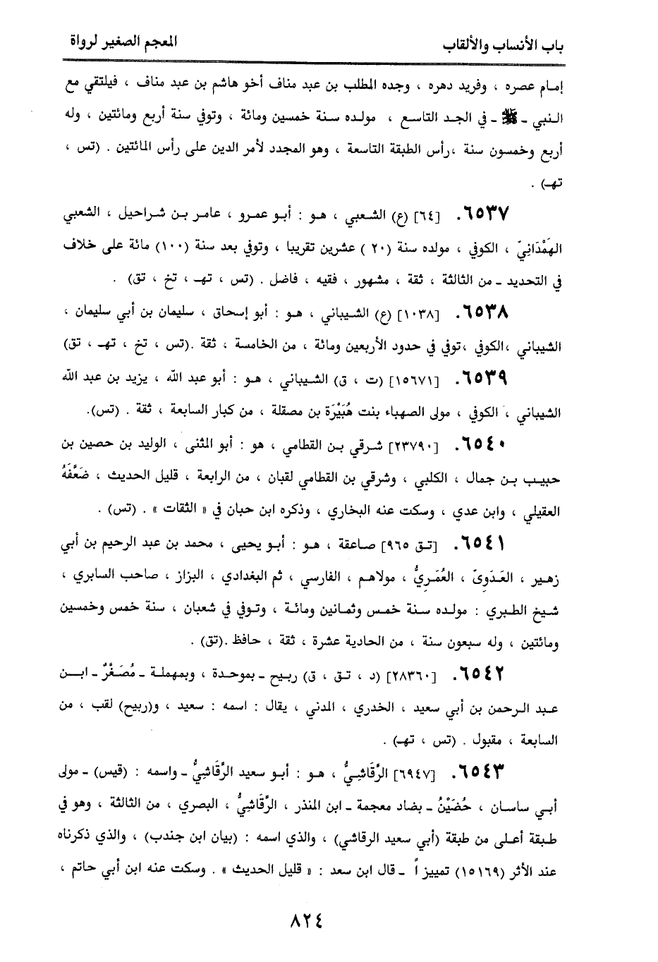 6537. [64] (ع) الشعبي، هو أبو عمرو، عامر بن شراحيل الشعبي الهمداني الكوفي، مولده سنة (20) عشرين تقريبا، وتوفي بعد سنة (100) مائة على خلاف في التحديد - من الثالثة، ثقة، مشهور، فقيه، فاضل. (تس، تخ، تهـ، تق).