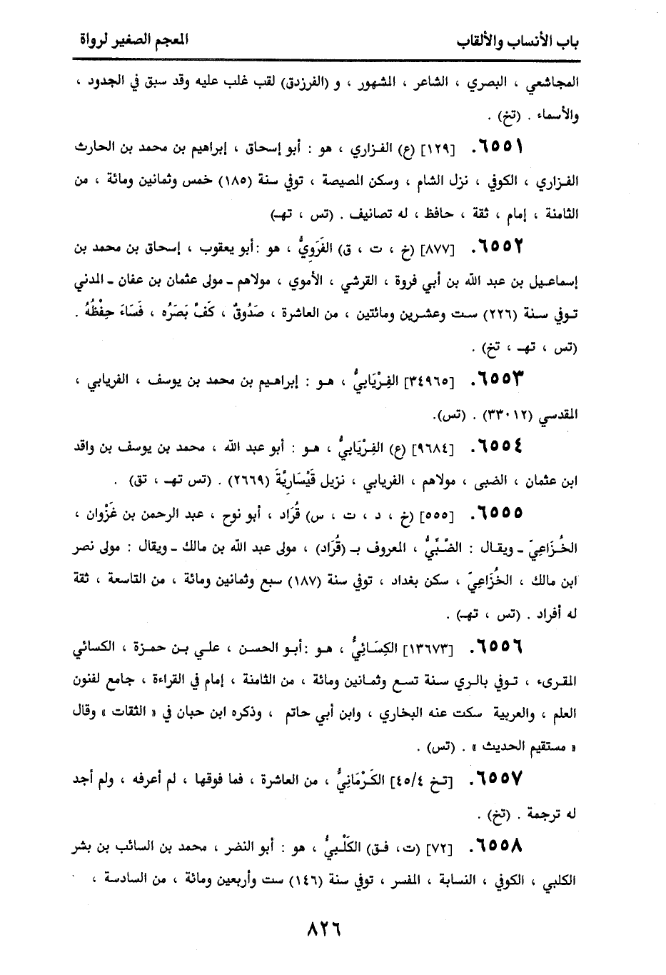 6554. [9684] (ع) الفريابي، هو أبو عبد الله، محمد بن يوسف بن واقد بن عثمان الضبي، مولاهم الفريابي، نزيل قيسارية (2669). (تس، تهـ تق).