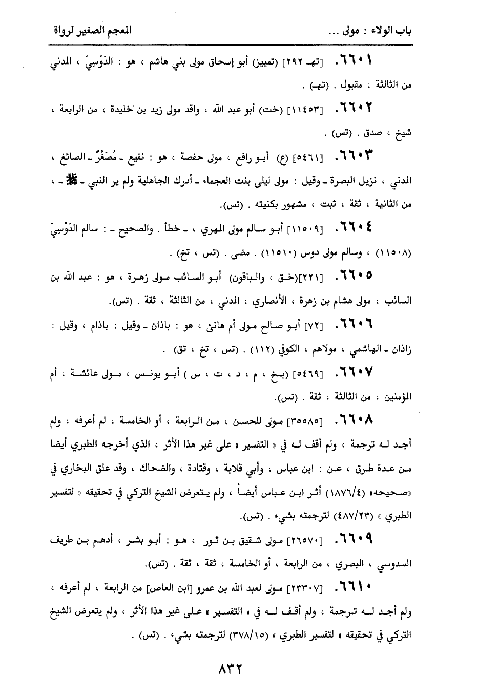 6610. [23307] مولى لعبد الله بن عمرو [بن العاص] من الرابعة لم أعرفه، ولم أجد له ترجمة، ولم أقف له في ((التفسير)) على غير هذا الأثر، ولم يتعرض الشيخ التركي في تحقيقه ((لتفسير الطبري)) (15/ 378) لترجمته بشيء. (تس).