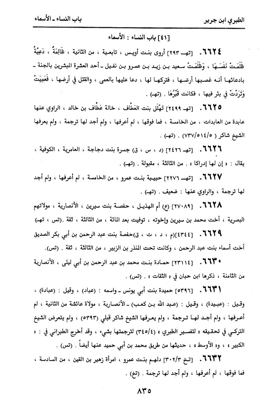 6627. [تهـ 2276] حبيبة بنت عمرو، من الخامسة، لم أعرفها، ولم أجد لها ترجمة، والراوي عنها: ضعيف. (تهـ).