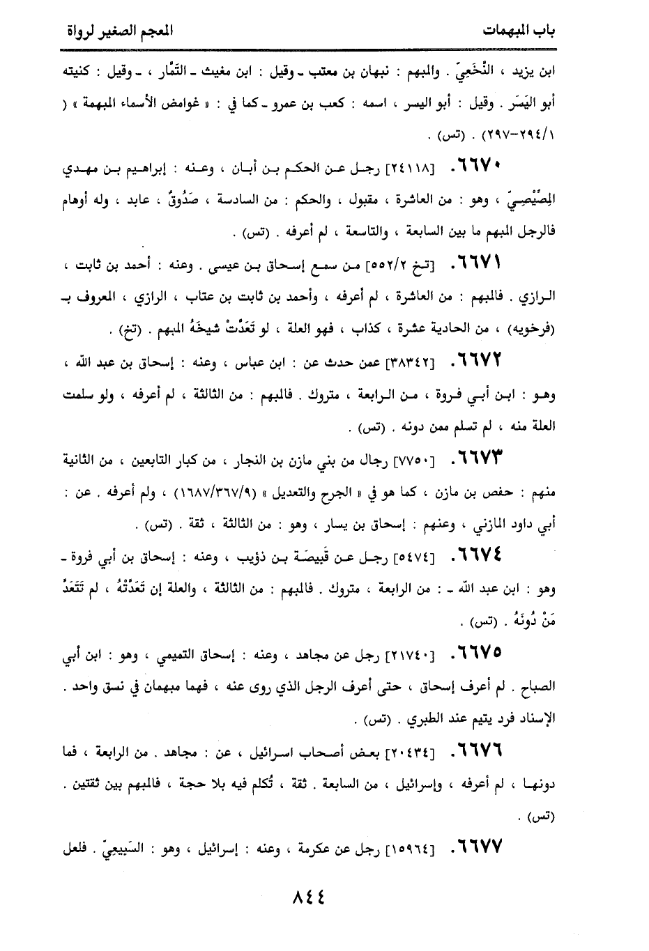 6674. [5474] رجل عن قبيصة بن ذؤيب، وعنه: إسحاق بن أبي فروة - وهو: ابن عبد الله -: من الرابعة، متروك، فالمبهم: من الثالثة، والعلة إن تعدته، لم تتعد من دونه. (تس).
