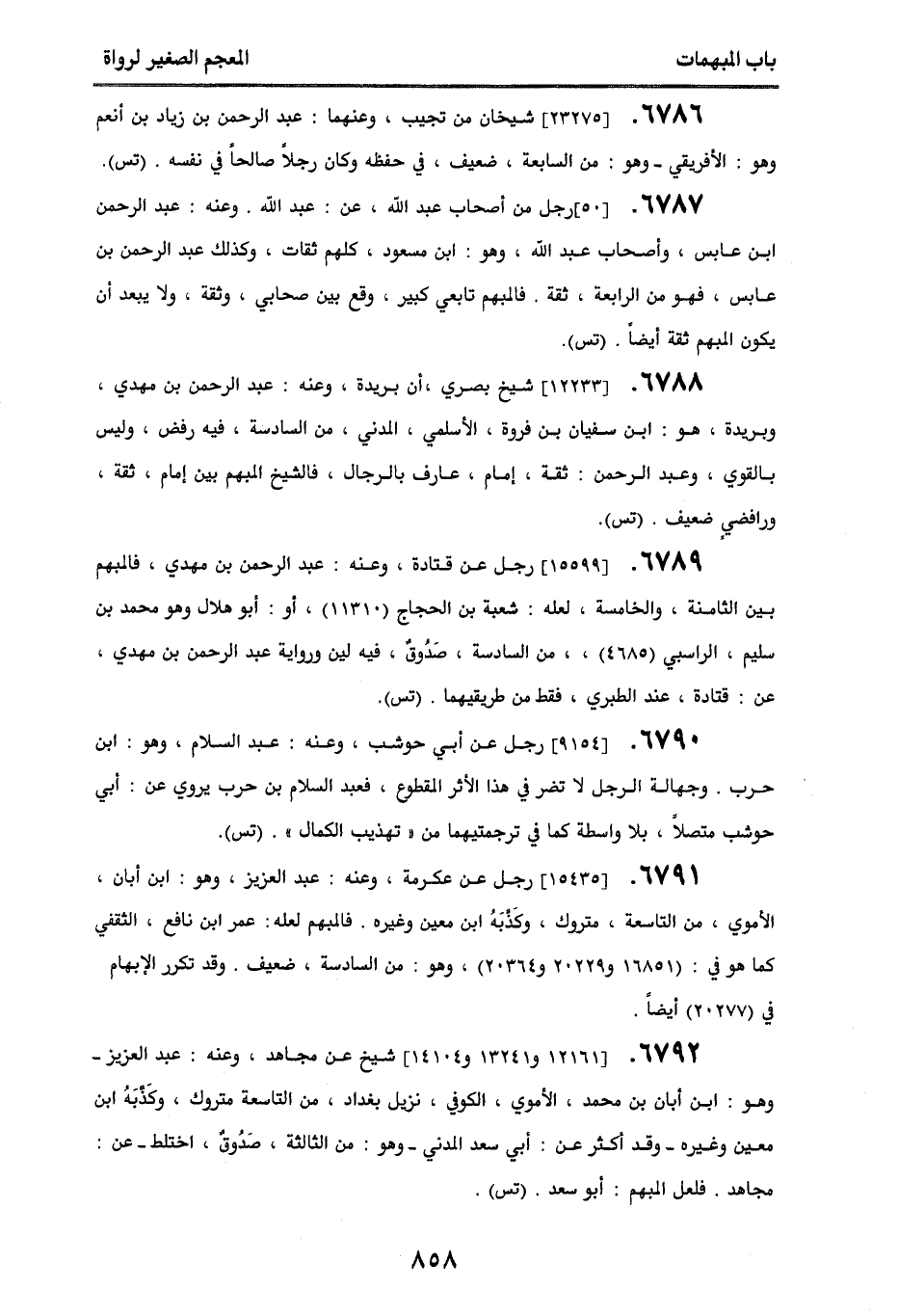 6787. [50] رجل من أصحاب عبد الله، عن عبد الله. وعنه عبد الرحمن بن عابس، وأصحاب عبد الله، وهو ابن مسعود، كلهم ثقات، وكذلك عبد الرحمن بن عابس، فهو من الرابعة، ثقة. فالمبهم تابعي كبير، وقع بين صحابي، وثقة، ولا يبعد أن يكون المبهم ثقة أيضًا. (تس).