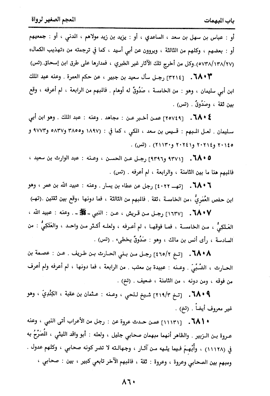 6803. [3214] رجل سأل سعيد بن جبير، عن حكم العمرة. وعنه عبد الملك بن أبي سليمان، وهو من الخامسة، صدوق له أوهام. فالمبهم من الرابعة، لم أعرفه، وقع بين ثقة وصدوق. (تس).
