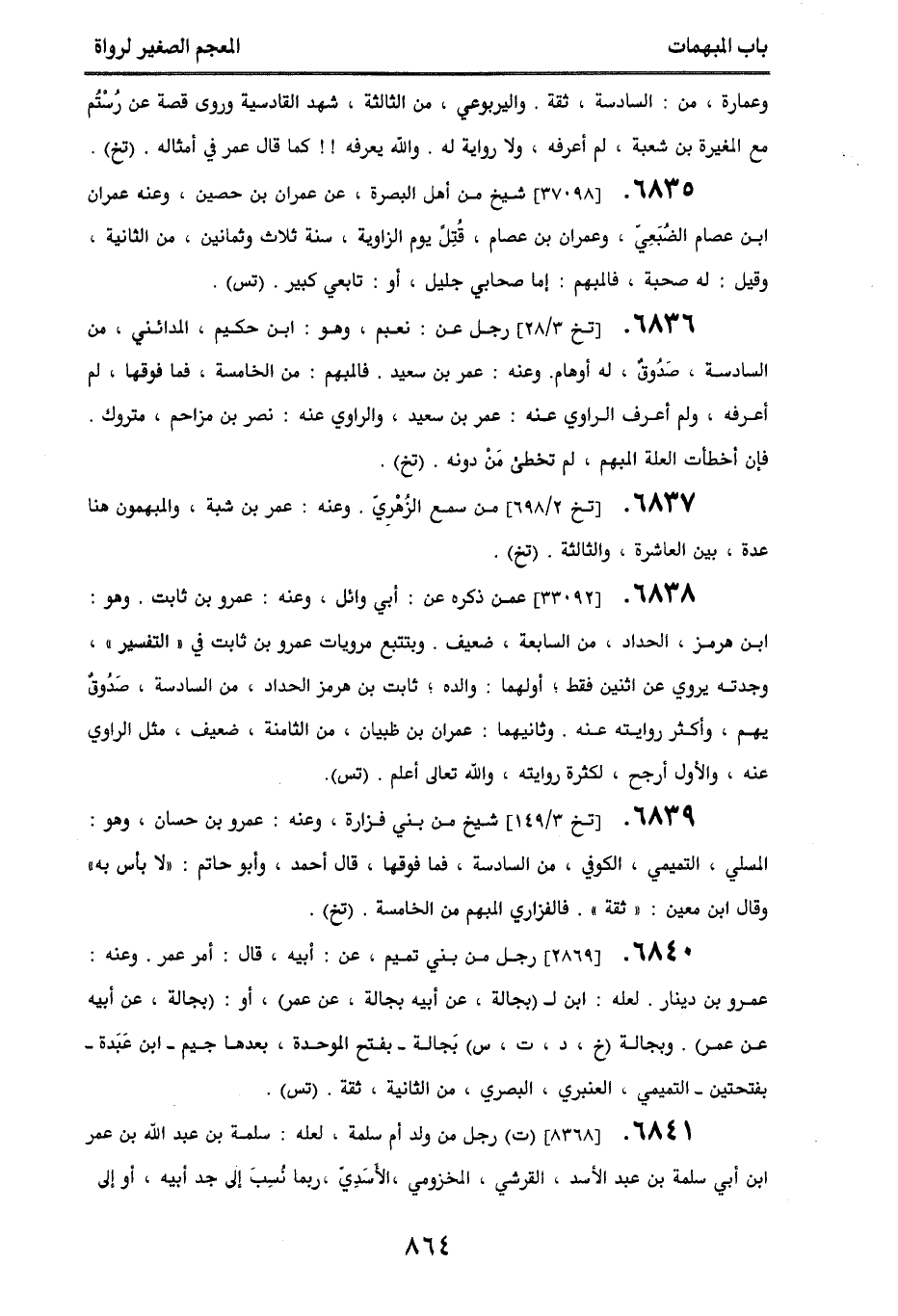 6840. [2869] رجل من بني تميم، عن أبيه، قال: أمر عمر. وعنه عمرو بن دينار. لعله ابن لـ (جبالة، عن أبيه بجالة، عن عمر)، أو (بجالة، عن أبيه عن عمر). وبجالة (خ، د، ت، س) بجالة - بفتح الموحدة، بعدها جيم - ابن عبدة - بفتحتين - التميمي العنبري البصري من الثانية، ثقة. (تس).