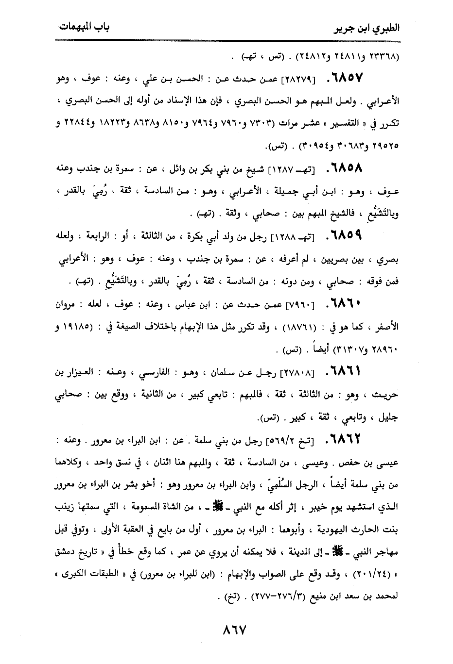 6861. [27808] رجل عن سلمان، وهو الفارسي، وعنه العيزار بن حريث، وهو من الثالثة، ثقة، فالمبهم: تابعي كبير من الثانية، ووقع بين صحابي جليل، وتابعي ثقة كبير. (تس).