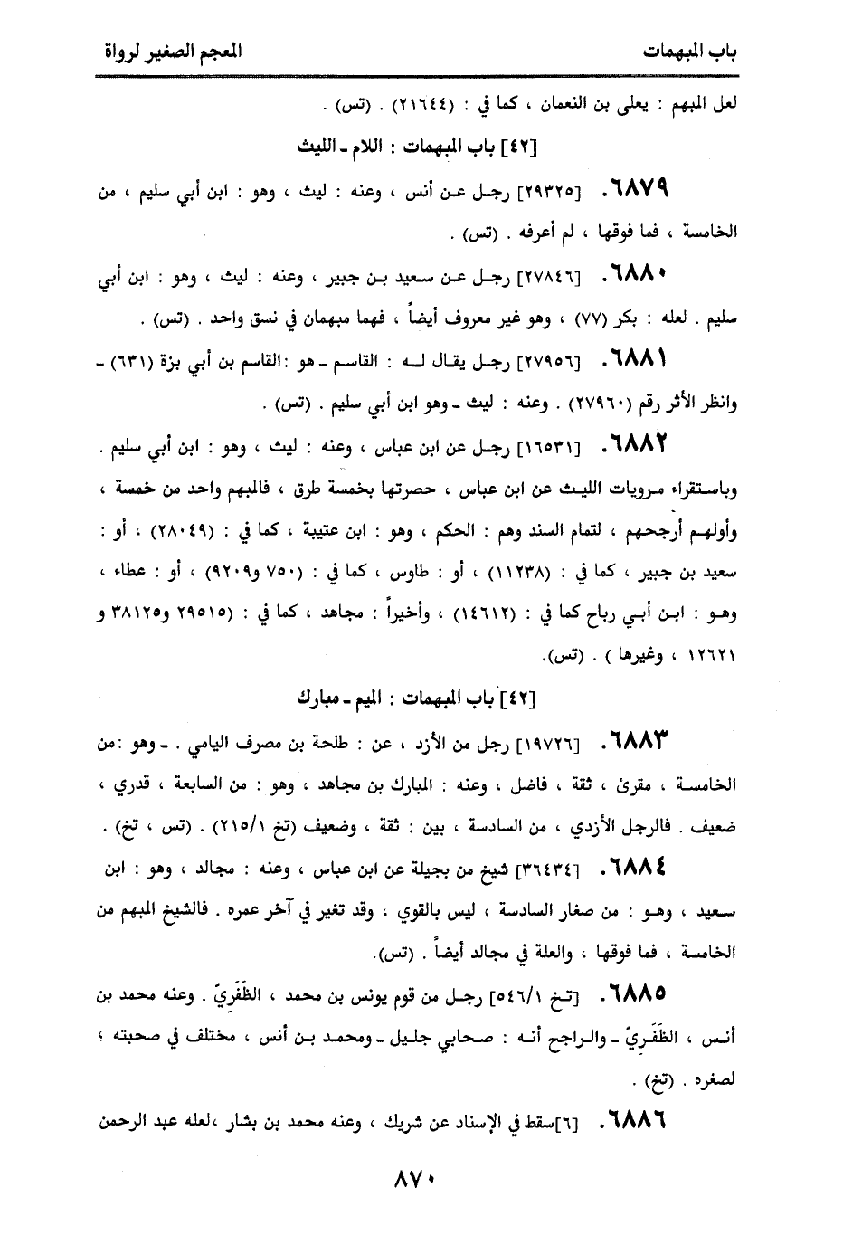 6882. [16531] رجل عن ابن عباس، وعنه ليث، وهو ابن أبي سليم. وباستقراء مرويات الليث عن ابن عباس، حصرتها بخمسة طرق، فالمبهم واحد من خمسة، وأولهم أرجحهم، لتمام السند وهم: الحكم، وهو ابن عتيبة، كما في: (28049)، أو سعيد بن جبير، كما في: (11238)، أو طاوس، كما في: (750 و9209)، أو عطاء، وهو ابن أبي رباح كما في: (14612)، وأخيرًا: مجاهد، كما في: (29515 و38125 و12621، وغيرها). (تس).