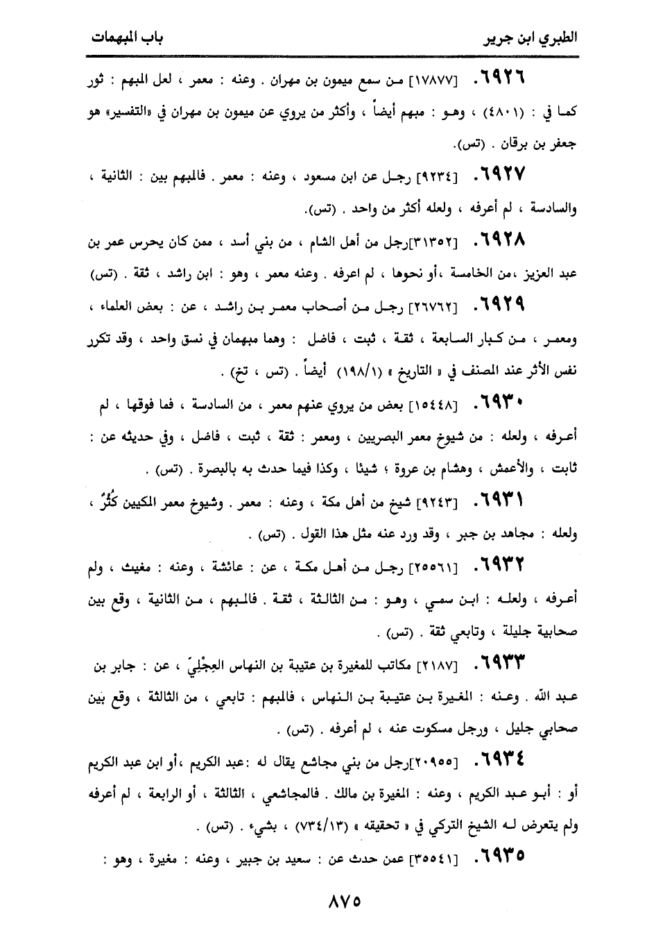 6926. [17877] من سمع ميمون بن مهران. وعنه معمر، لعل المبهم: ثور كما في: (4801)، وهو مبهم أيضًا، وأكثر من يروي عن ميمون بن مهران في ((التفسير)) هو جعفر بن برقان. (تس).