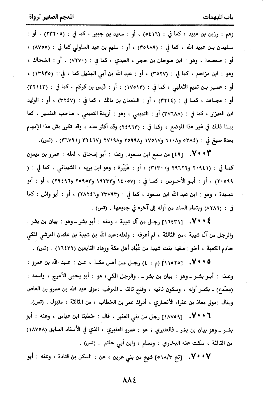 7004. [16431] رجل من آل شيبة، وعنه أبو بشر - وهو بيان بن بشر. والرجل من آل شيبة، من الثالثة، لم أعرفه، ولعله عبد الله بن شيبة بن عثمان القرشي المكي خادم الكعبة، أخو: صفية بنت شيبة من عباد أهل مكة وزهاد التابعين (16432). (تس).