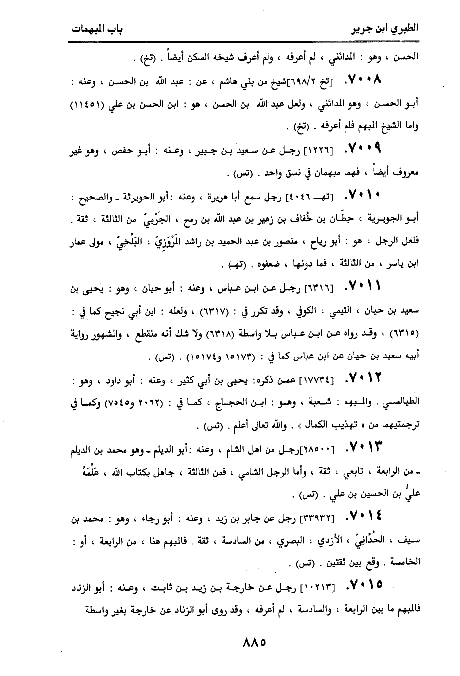 7014. [33932] رجل عن جابر بن زيد، وعنه أبو رجاء، وهو محمد بن سيف الحداني الأزدي البصري، من السادسة، ثقة. فالمبهم هنا من الرابعة، أو الخامسة. وقع بين ثقتين. (تس).