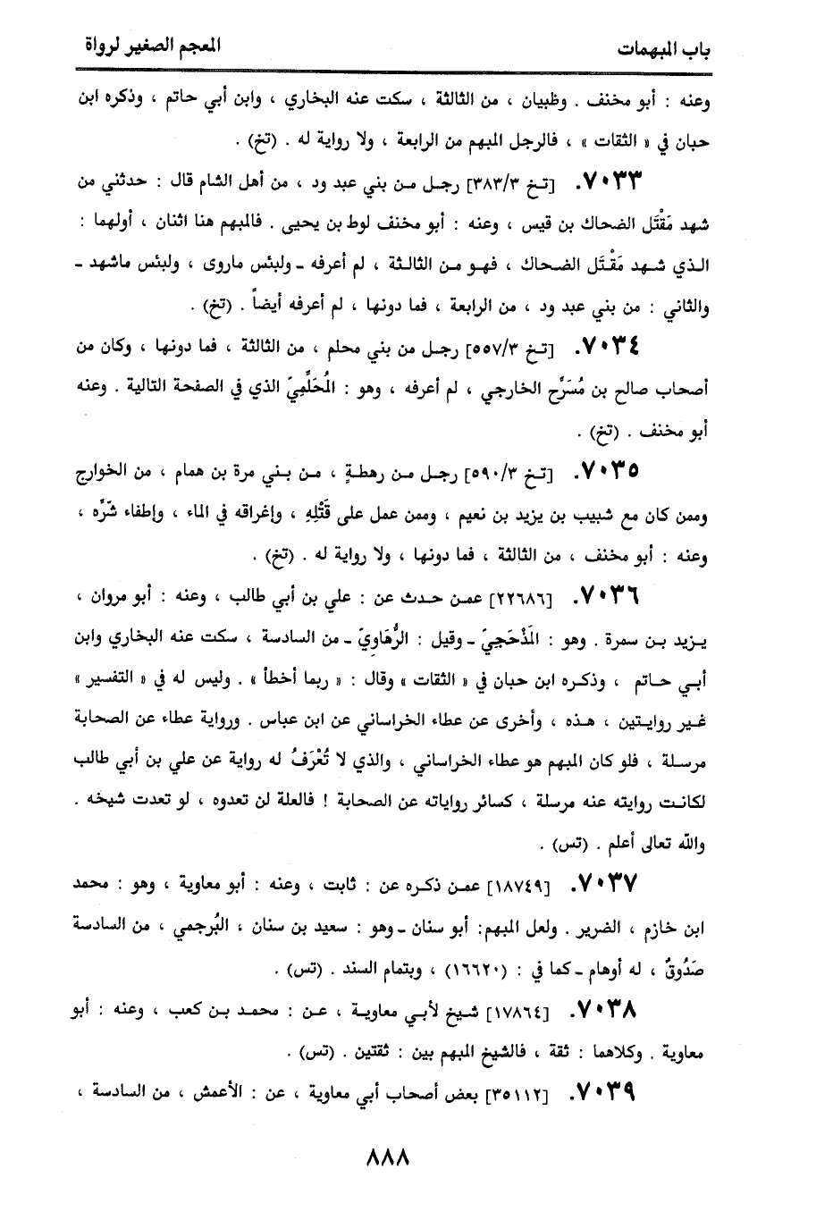 7034. [تخ 3/ 557] رجل من بني محلم من الثالثة، فما دونها، وكان من أصحاب صالح بن مسرح الخارجي، لم أعرفه، وهو المحلمي الذي في الصفحة التالية، وعنه أبو مخنف. (تخ).