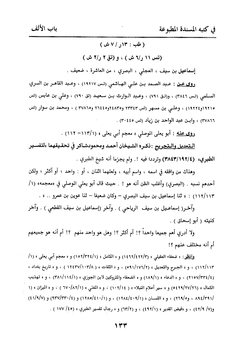 وانظر: " ضعفاء العقيلي " (3/ 422 / 1462) و " الكامل " (1/ 324 / 152) و " معجم أبي يعلى " (1/ 113 / 112)، و " الجرح والتعديل " (2/ 176 / 591)، و " الثقات " (8/ 103 / 12437)، و " تاريخ بغداد " (4/ 334 / 2157)، و " الدعاء " (1/ 189) و " الضعفاء والمتروكين لابن الجوزي " (1/ 114 / 381)، و " تهذيب الكمال " (26/ 27 / 5429) و " سير أعلام النبلاء " (14/ 102)، و " المغني " (1/ 82 / 670)، و " الميزان " (1/ 391 / 894، و 5/ 269) و " اللسان " (1/ 409 / 1284)، و (1/ 410 / 1285) و (4/ 330 / 937) و (7/ 9 / 41) و (7/ 9 / 42)، و " فيض القدير " (1/ 492)، و (2/ 63) و " رجال تفسير الطبري " (45/ 177).