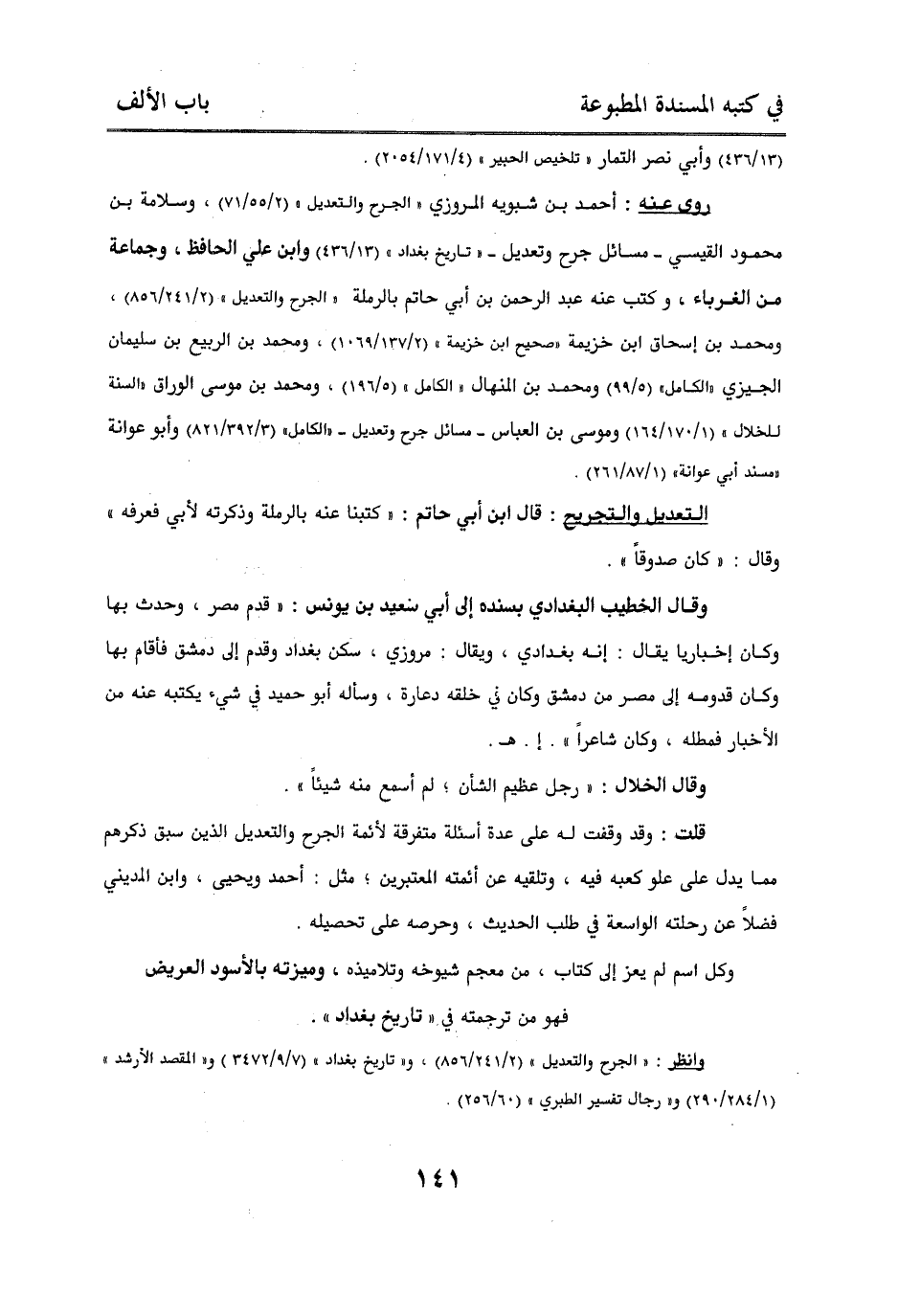 وانظر: " الجرح والتعديل " (2/ 241 / 856)، و " تاريخ بغداد " (7/ 9 / 3472) و " المقصد الأرشد " (1/ 284 / 290) و " رجال تفسير الطبري " (60/ 256).