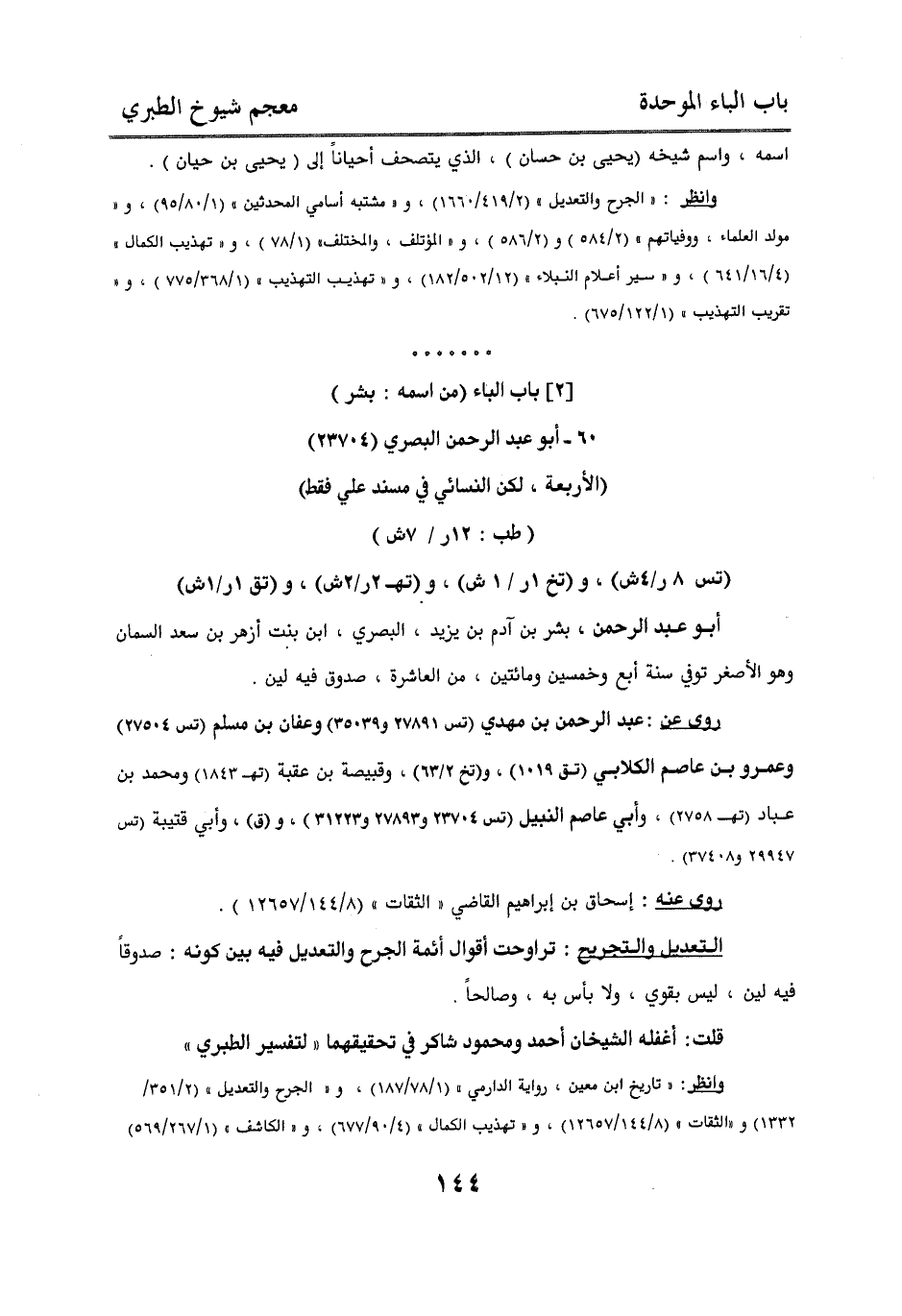 وانظر: " الجرح والتعديل " (2/ 419 / 1660)، و " مشتبه أسامي المحدثين (1/ 80 / 95) و " مولد العلماء، ووفياتهم " (2/ 584) و (2/ 586)، و " المؤتلف، والمختلف " (1/ 78)، و " تهذيب الكمال " (4/ 16 / 641)، و " سير أعلام النبلاء (12/ 502 / 182)، و " تهذيب التهذيب " (1/ 368 / 775)، و " تقريب التهذيب " (1/ 122 / 675).