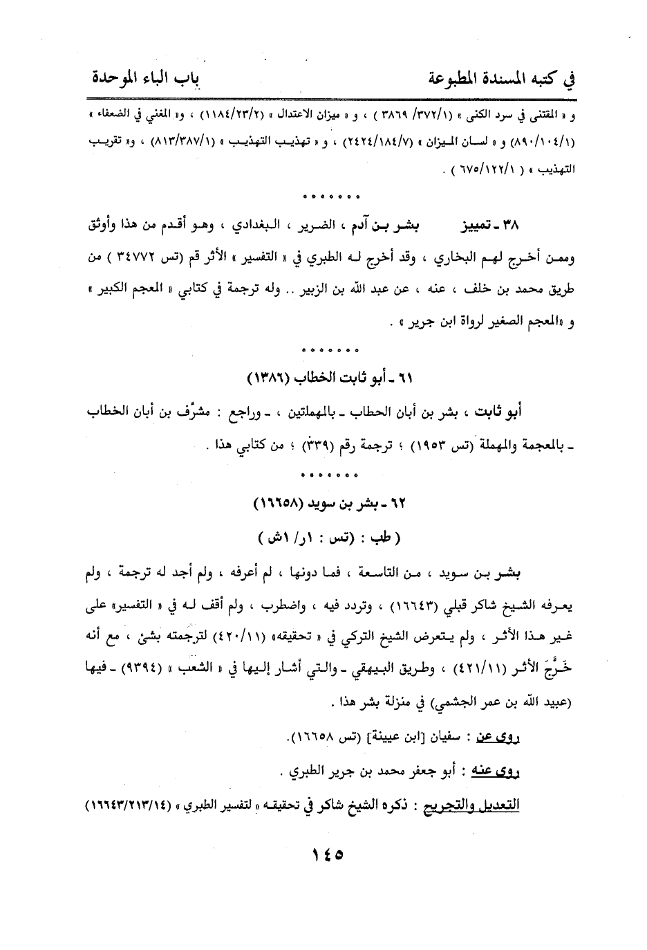 38 - تمييز بشر بن آدم، الضرير، البغدادي، وهو أقدم من هذا وأوثق وممن أخرج لهم البخاري، وقد أخرج له الطبري في " التفسير " الأثر قم (تس 34772) من طريق محمد بن خلف، عنه، عن عبد الله بن الزبير .. وله ترجمة في كتابي، المعجم الكبير " و "المعجم الصغير لرواة ابن جرير ".