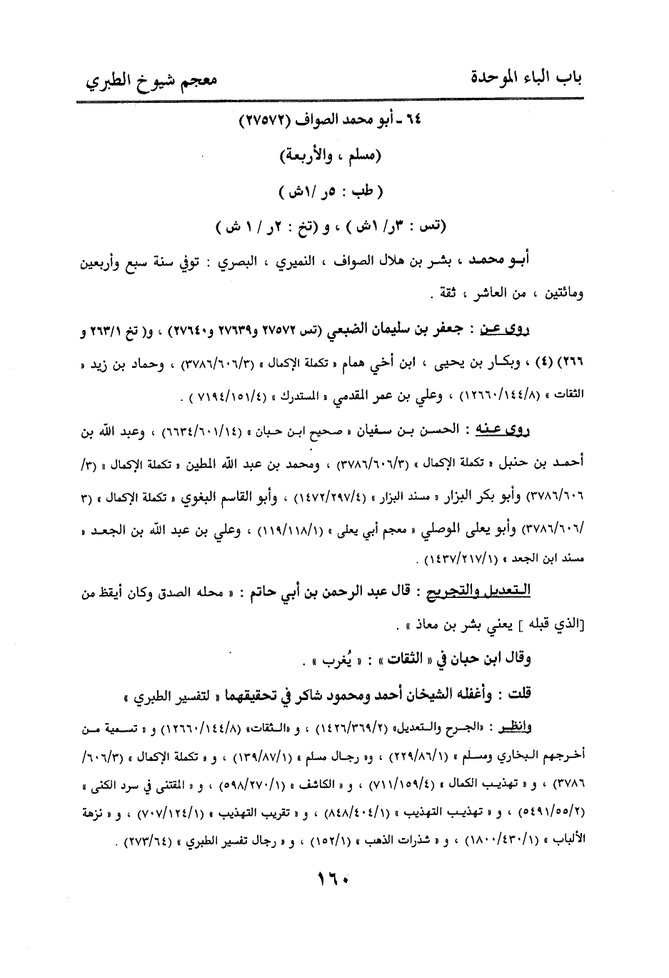 أبو محمد، بشر بن هلال الصواف " النميري " البصري: توفي سنة سبع وأربعين ومائتين، من العاشرة، ثقة.
