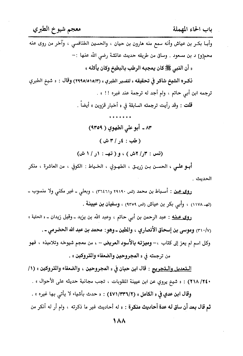 وكل اسم لم يعز إلى كتاب - وميزته بالأسود العريض - من معجم شيوخه وتلاميذه، فهو من ترجمته في " المجروحين والضعفاء والمتروكين ".
