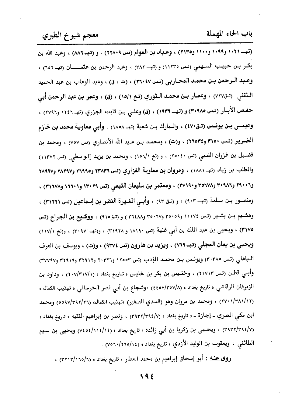(تهـ 1021 و 1099 و 1100 و 2135)، وعباد بن العوام، (تس 22809)، و (تهـ 886)، وعبد الله بن بكر بن حبيب السهمي (تس 11235) و (تهـ 382)، وعبد الرحمن بن عثمان، (تهـ 652)، وعبد الرحمن بن محمد المحاربي، (تس 26047)، (ت، ق)، وعبد الوهاب بن عبد الحميد الثقفي (تق 727)، وعمار بن محمد الثوري (تخ 1/ 15)، (ق)، وعمر بن عبد الرحمن أبي حفص الأبار (تس 30985)، و (تهـ 1939)، (ق) وعلي بن ثابت الجزري (تهـ 1246 و 2796)، وعيسى بن يونس (تق 470)، والمبارك بن شعبة (تهـ 1858)، وأبي معاوية محمد بن خازم الضرير (تس 3150 و 26534)، و (ت)، ومحمد بن عبد الله الأنصاري (تس 757)، ومحمد بن فضيل بن غزوان الضبي، (تس 25040) و (تخ 1/ 156)، ومحمد بن يزيد [الواسطي] (تس 11372)، والمطلب بن زياد (تهـ 1881)، ومروان بن معاوية الفزاري (تس 23836 و 26995 و 28297 و 28997 و 29006 و 30986 و 35678 و 37190)، ومعتمر بن سليمان التيمي (تس 3029 و 16601 و 31678)، ومنصور بن سلمة (تهـ 903)، و (تق 93)، وأبي المغيرة النضر بن إسماعيل (تس 31221)، وهشيم بن بشير (تس 11174 و 35059 و 35067 و 36488) و (تق 915)، ووكيع بن الجراح (تس 3179)، ويحيى بن عبد الملك بن أبى غنية (تس 18190 و 31928)، و (تهـ 3097)، و (تخ 1/ 117)، ويحيى بن يمان العجلي (تهـ 769)، ويزيد بن هارون (تس 9374)، و (ت)، ويوسف بن العرف الباهلي (تس 30385)، ويونس بن محمد المؤدب (تس 12553 و 20326 و 32912 و 32919 و 37797)، وأبى قطن (تس 21713)، وخنيس بن بكر بن خنيس «تاريخ بغداد» (1/ 317/207)، وداود بن الزبرقان الرقاشى «تاريخ بغداد» (8/ 357/4457)، وشجاع بن أبى نصر الخرساني «تهذيب الكمال» (12/ 381/2701)، ومحمد بن مروان وهو (السدي الصغير) «تهذيب الكمال» (26/ 392/5597)، ومحمد بن مكي المصري - إجازة - «تاريخ بغداد» (7/ 394/3932)، ونصر بن إبراهيم الفقيه «تاريخ بغداد» (7/ 394/3932)، ويحيى بن زكريا بن أبى زائدة «تاريخ بغداد» (14/ 114/7454)، ويحيى بن سليم الطائفي، ويعقوب بن الوليد الأزدي «تاريخ بغداد» (14/ 265/7560).