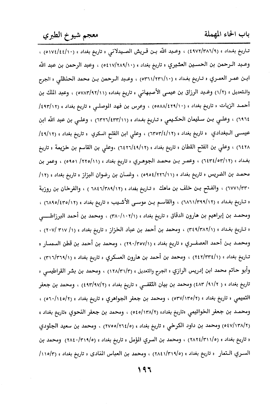 «تاريخ بغداد» (9/ 386/4972)، وعبد الله بن قريش الصيدلاني «تاريخ بغداد» (10/ 44/5174)، وعبد الرحمن بن الحسين العشيري «تاريخ بغداد» (10/ 289/5417)، وعبد الرحمن بن عبد الله بن عمر العمري «تاريخ بغداد» (10/ 231/5631)، وعبد الرحمن بن محمد الحنظلي «الجرح والتعديل» (2/ 1) وعبد الرزاق بن عيسى الأصبهاني «تاريخ بغداد» (11/ 92/5783)، وعبد الملك بن أحمد الزيات «تاريخ بغداد» (10/ 429/5588)، وعرس بن فهد الموصلي «تاريخ بغداد» (12/ 493/6964)، وعلي بن سليمان الحكيمي «تاريخ بغداد» (11/ 433/6326)، وعلي بن عبد الله بن عيسى البغدادي «تاريخ بغداد» (12/ 4/6353)، وعلي بن الفتح السكري «تاريخ بغداد» (12/ 49/6428)، وعلي بن الفتح القطان «تاريخ بغداد» (12/ 49/6428)، وعلي بن القاسم بن خزيمة «تاريخ بغداد» (12/ 53/6434)، وعمر بن محمد الجوهري «تاريخ بغداد» (11/ 225/5951)، وعمر بن محمد بن الضريس «تاريخ بغداد» (11/ 226/5954)، وغسان بن رضوان البزاز «تاريخ بغداد» (12/ 330/6771)، والفتح بن خلف بن ماهك «تاريخ بغداد» (12/ 389/6846)، والفرخان بن روزبة «تاريخ بغداد» (12/ 399/6861)، والقاسم بن موسى الأشيب «تاريخ بغداد» (12/ 435/6895)، ومحمد بن إبراهيم بن هارون الدقاق «تاريخ بغداد» (1/ 102/380)، ومحمد بن أحمد البرزاطي «تاريخ بغداد» (1/ 382/349)، ومحمد بن أحمد بن عباد الخزاز «تاريخ بغداد» (1/ 317/207)، ومحمد بن أحمد العصفري «تاريخ بغداد» (1/ 357/290)، ومحمد بن أحمد بن قطن السمسار «تاريخ بغداد» (1/ 334/242)، ومحمد بن أحمد بن هارون العسكري «تاريخ بغداد» (1/ 369/316)، وأبو حاتم محمد بن إدريس الرازي «الجرح والتعديل» (3/ 31/128)، ومحمد بن بشر القراطيسي «تاريخ بغداد» (2/ 91/483)، ومحمد بن بيان الثقفي «تاريخ بغداد» (2/ 97/493)، ومحمد بن جعفر التميمي «تاريخ بغداد» (2/ 135/537)، ومحمد بن جعفر الجواهري «تاريخ بغداد» (2/ 145/560)، ومحمد بن جعفر الخواتيمي «تاريخ بغداد» (2/ 138/545)، ومحمد بن جعفر النحوي «تاريخ بغداد» (2/ 138/547) ومحمد بن داود الكرخي «تاريخ بغداد» (5/ 264/2755)، ومحمد بن سعيد الجلودي «تاريخ بغداد» (5/ 311/2824)، ومحمد بن السري المؤمل «تاريخ بغداد» (5/ 319/2840) ومحمد بن السري التمار «تاريخ بغداد» (5/ 319/2841)، ومحمد بن العباس المنادى «تاريخ بغداد» (3/ 115/1127)