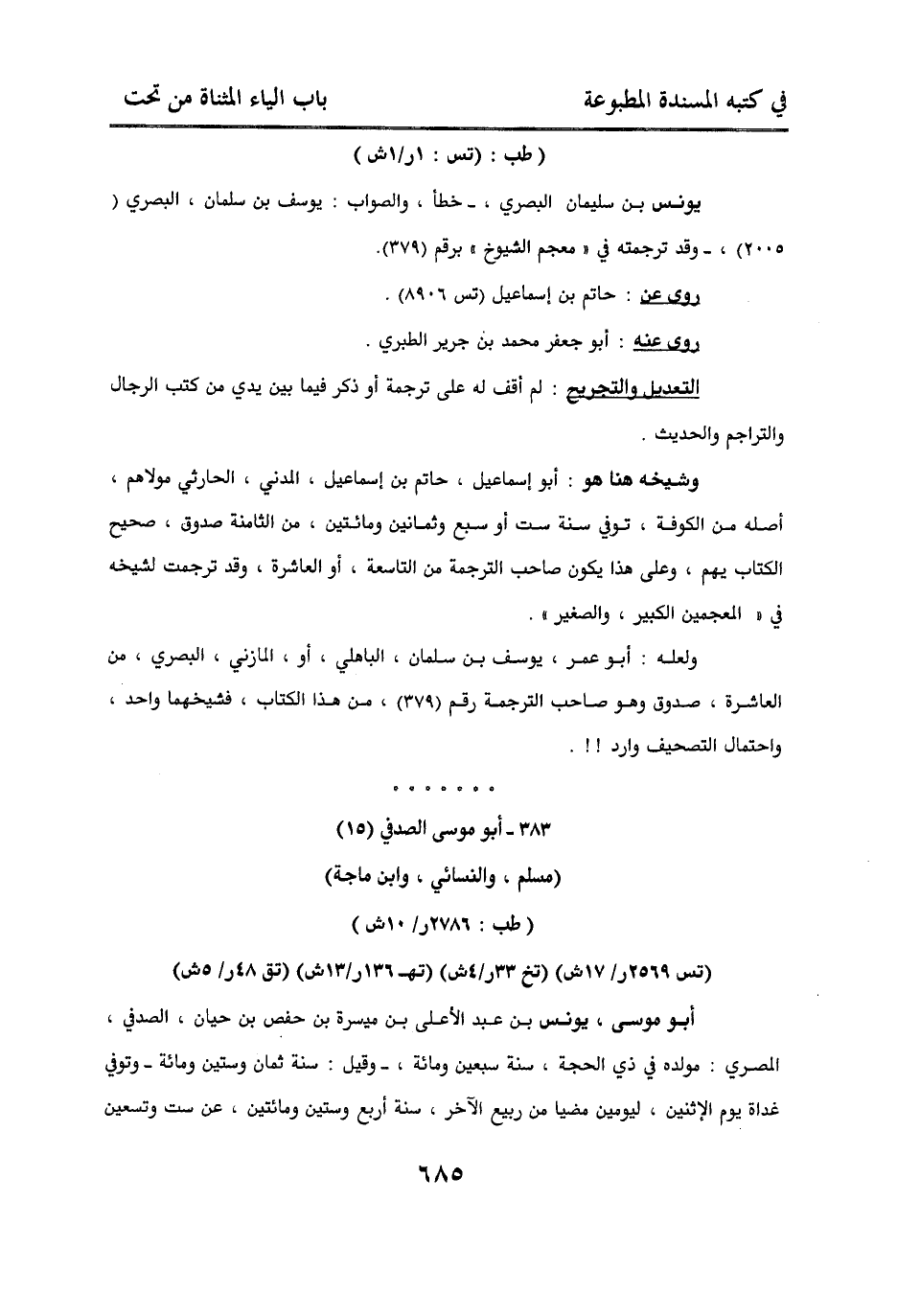 أبو موسى، يونس بن عبد الأعلى بن ميسرة بن حفص بن حيان، الصدفي المصري: مولده في ذي الحجة، سنة سبعين ومائة ـ وقيل: سنة ثمان وستين ومائة ـ وتوفي غداة يوم الإثنين، ليومين مضيا من ربيع الآخر. سنة أربع ومائتين، عن ست وتسعين