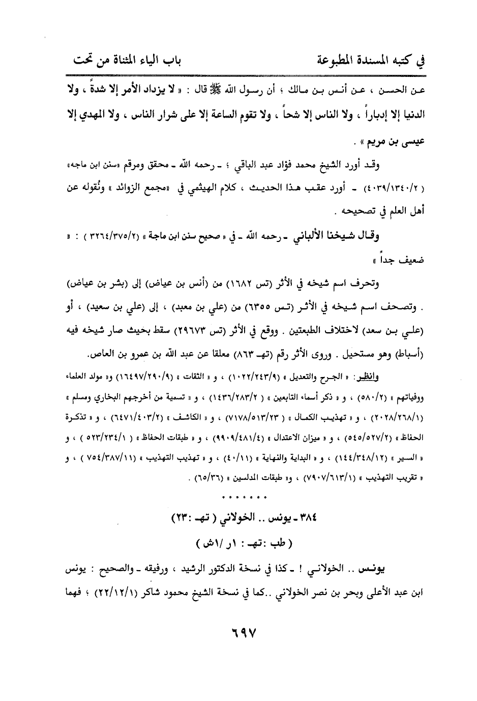 يونس ... الخولاني! - كذا في نسخة الدكتور الرشيد، ورفيقه - والصحيح: يونس بن عبد الأعلى، وبحر بن نصر الخولاني .. كما في نسخة الشيخ محمود شاكر (1/ 12 / 22)؛ فهما