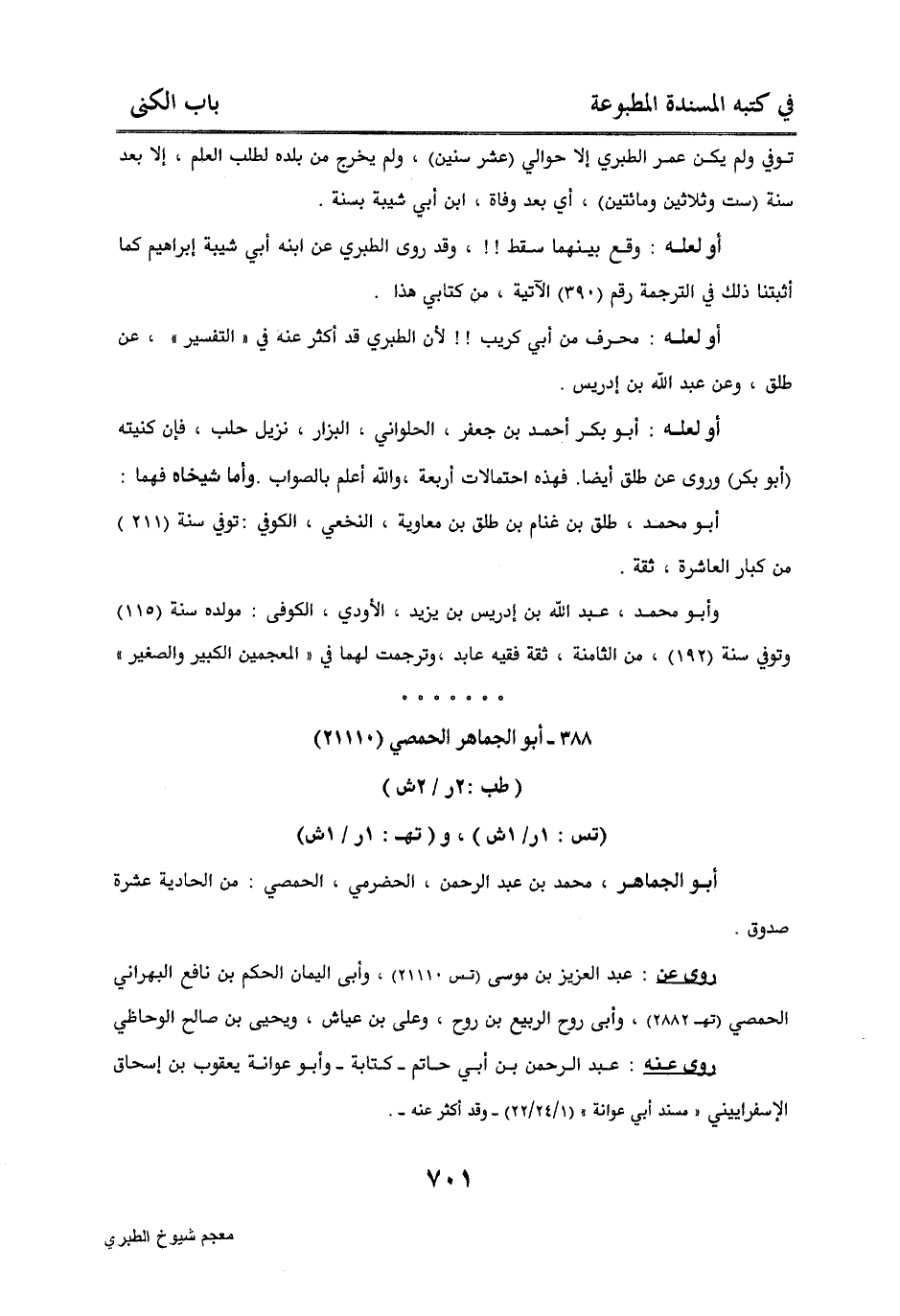 أو لعله: وقع بينهما سقط!!، وقد روى الطبري عن ابنه أبي شيبة إبراهيم كما أثبتنا ذلك في الترجمة رقم (390) الآتية، من كتابي هذا.