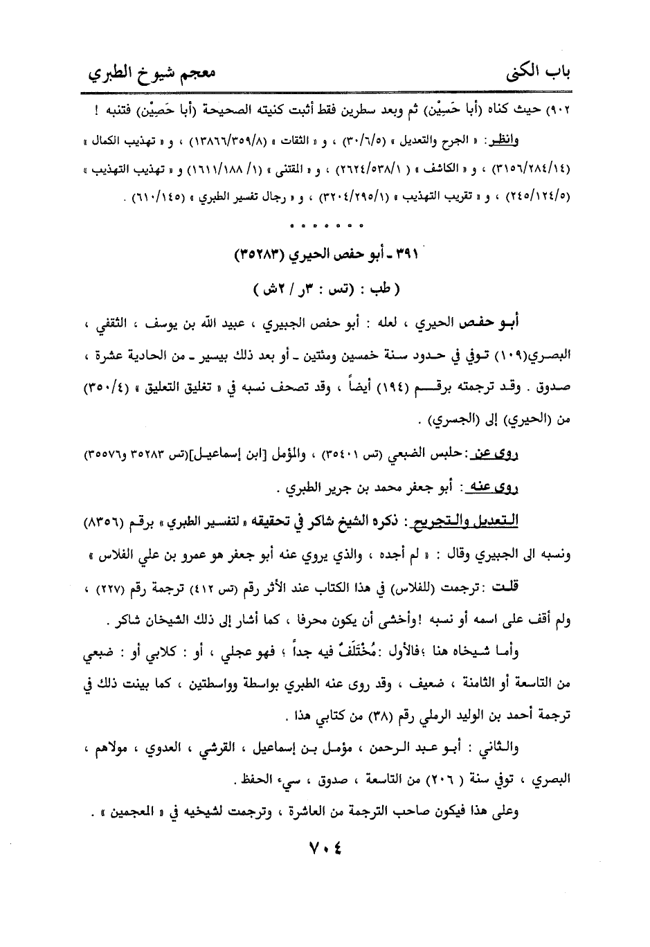 التعديل والتجريح: ذكره الشيخ شاكر في تحقيقه، لتفسير الطبري، برقم (8356) ونسبه إلى الجبيري وقال: “ لم أجده، والذي يروي عنه أبو جعفر هو عمرو بن علي الفلاس.