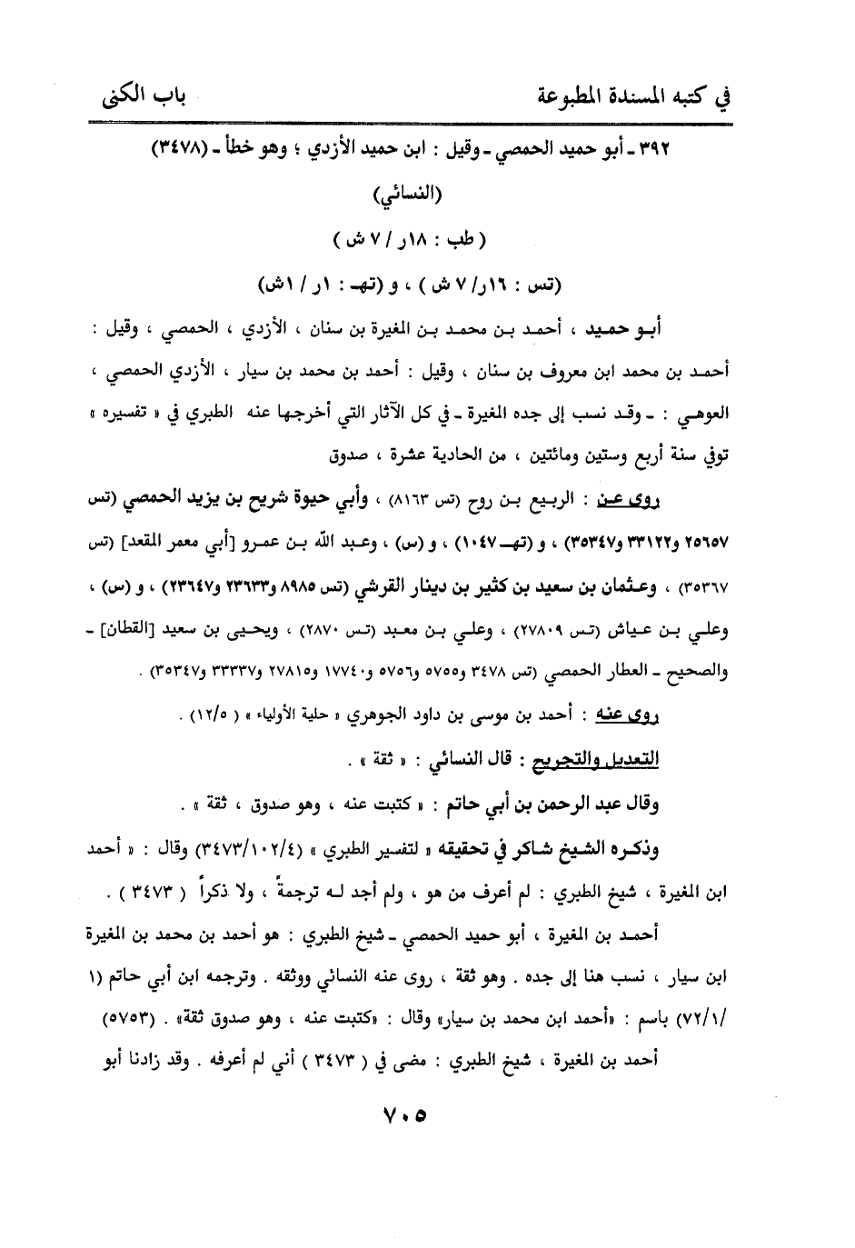 أحمد بن الغيرة، أبو حميد الحمصي - شيخ الطبري: هو أحمد بن محمد بن المغيرة بن سار) نسب هنا إلى جده. وهو ثقة، روى عنه النسائي ووثقه. وترجمه ابن أبي حاتم (1/ 1 / 72) باسم: “ أحمد بن محمد بن سيار “ وقال: “ كتبت عنه، وهو صدوق ثقة “. (5753) أحمد بن المغيرة، شيخ الطبري: مضى في (3473) أني لم أعرفه. وقد زادنا أبو